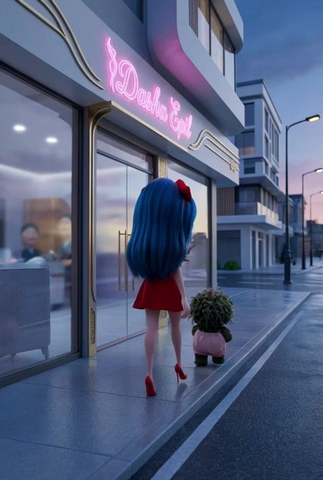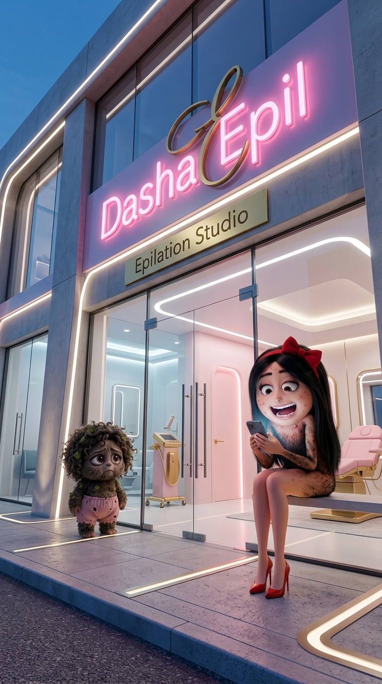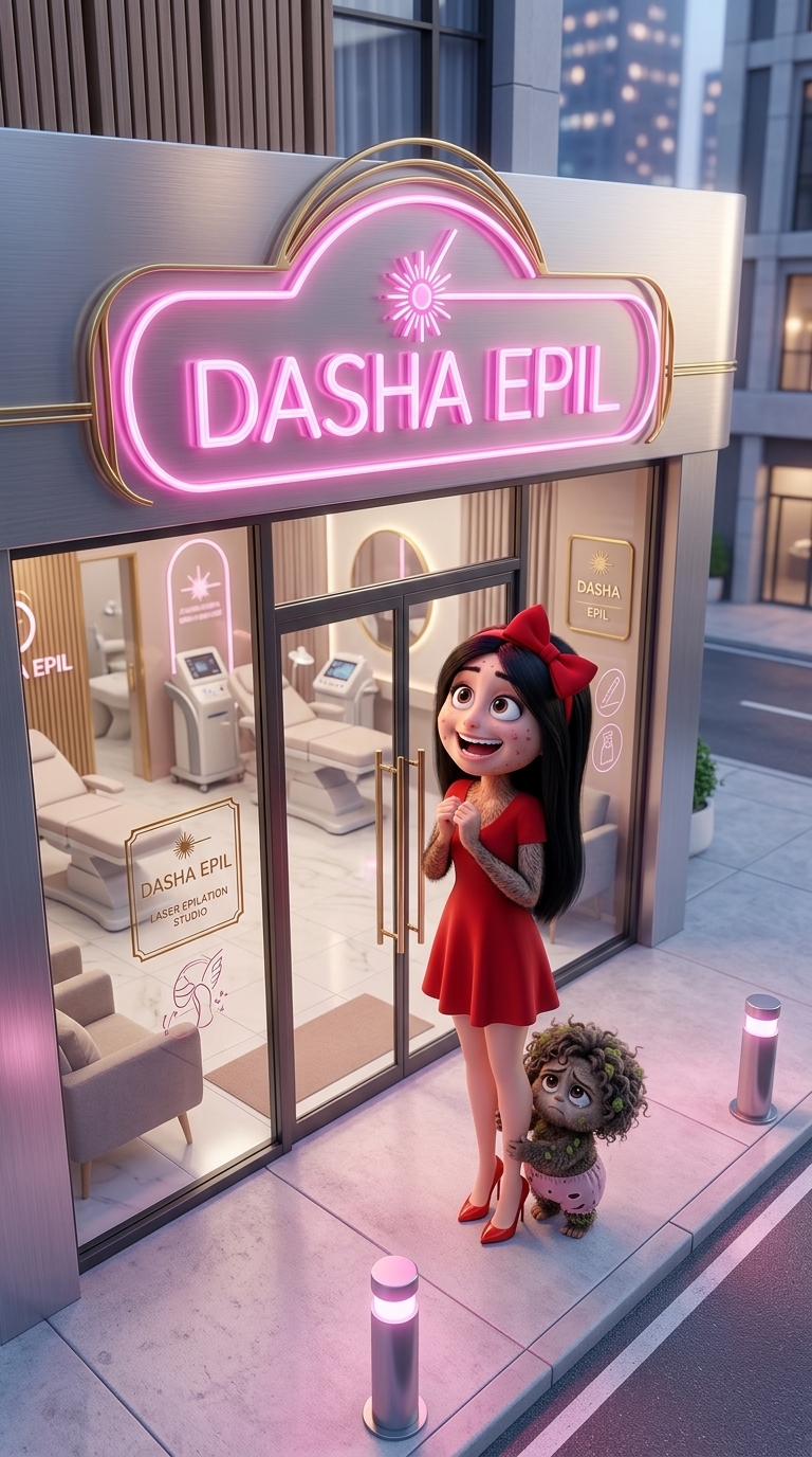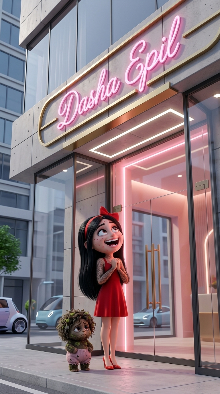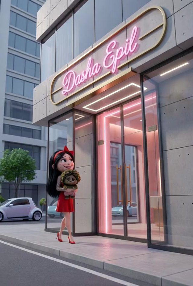Strong rule: style --- 3D Pixar ---. Фасад современной и стильной студии 'Dasha Epil'. Вход оформлен стильной розовой неоновой вывеской и...