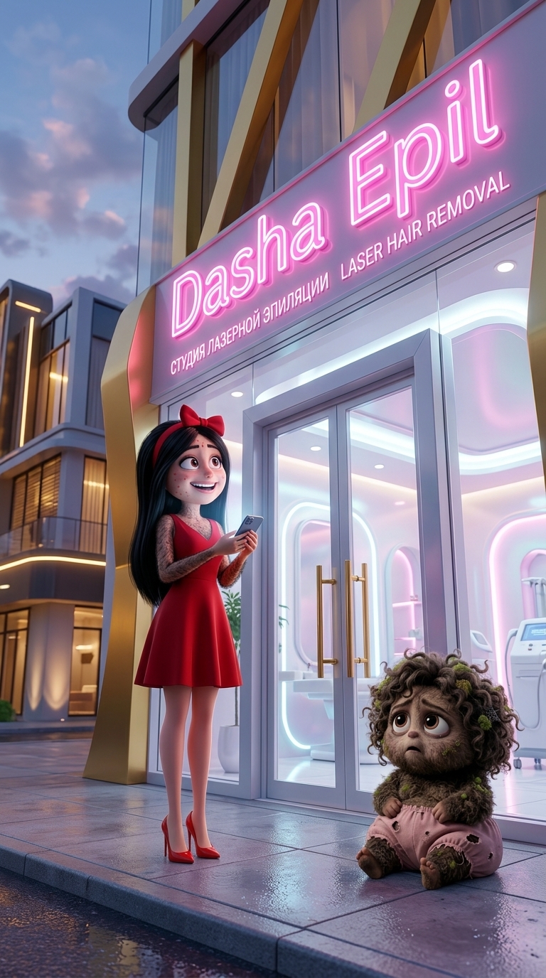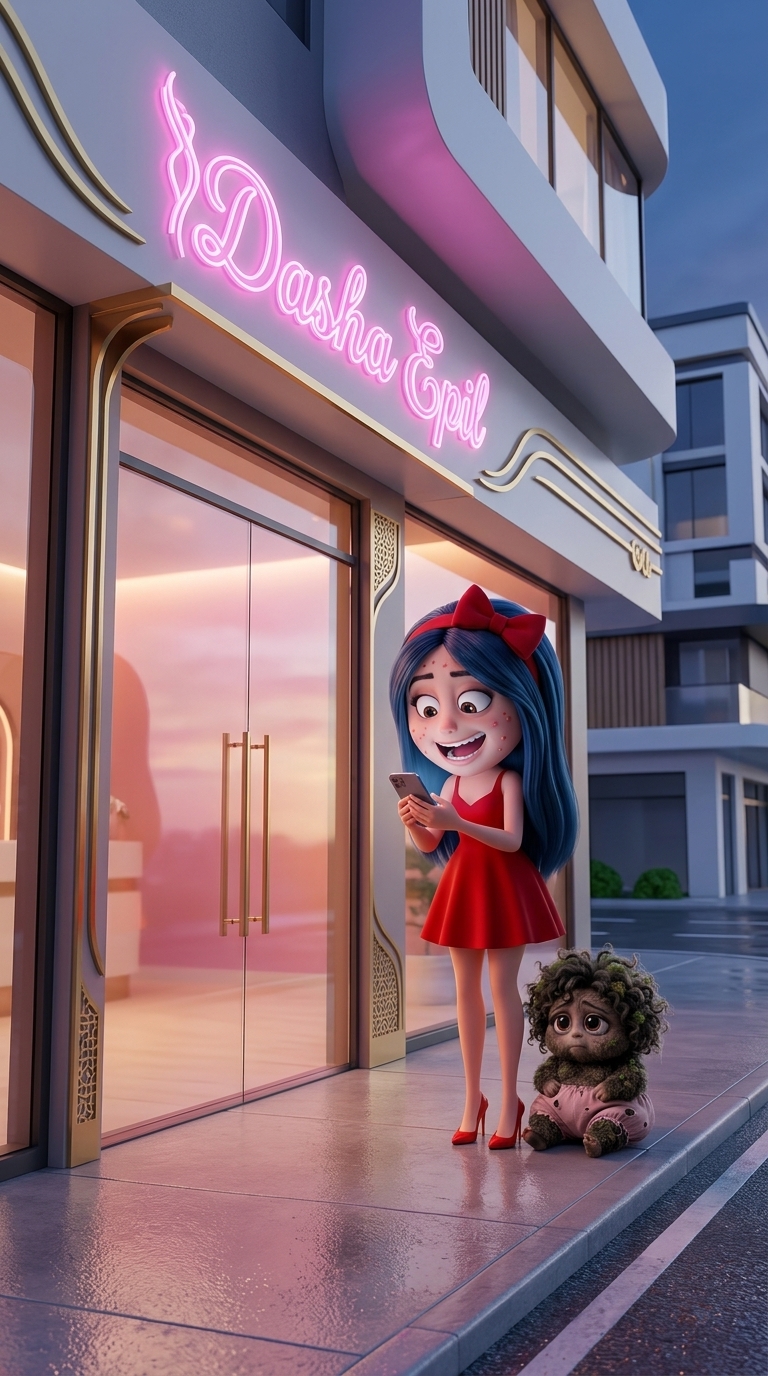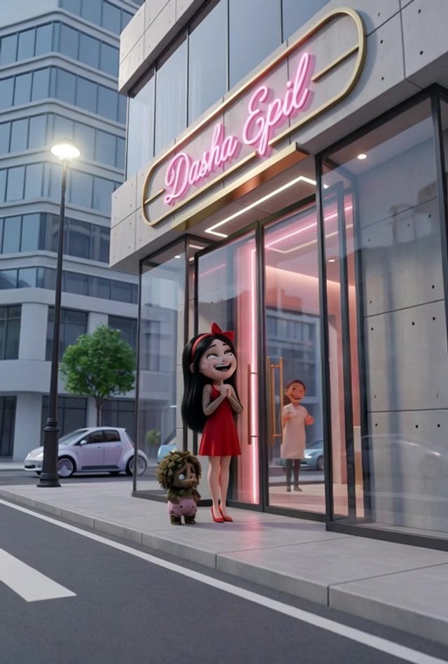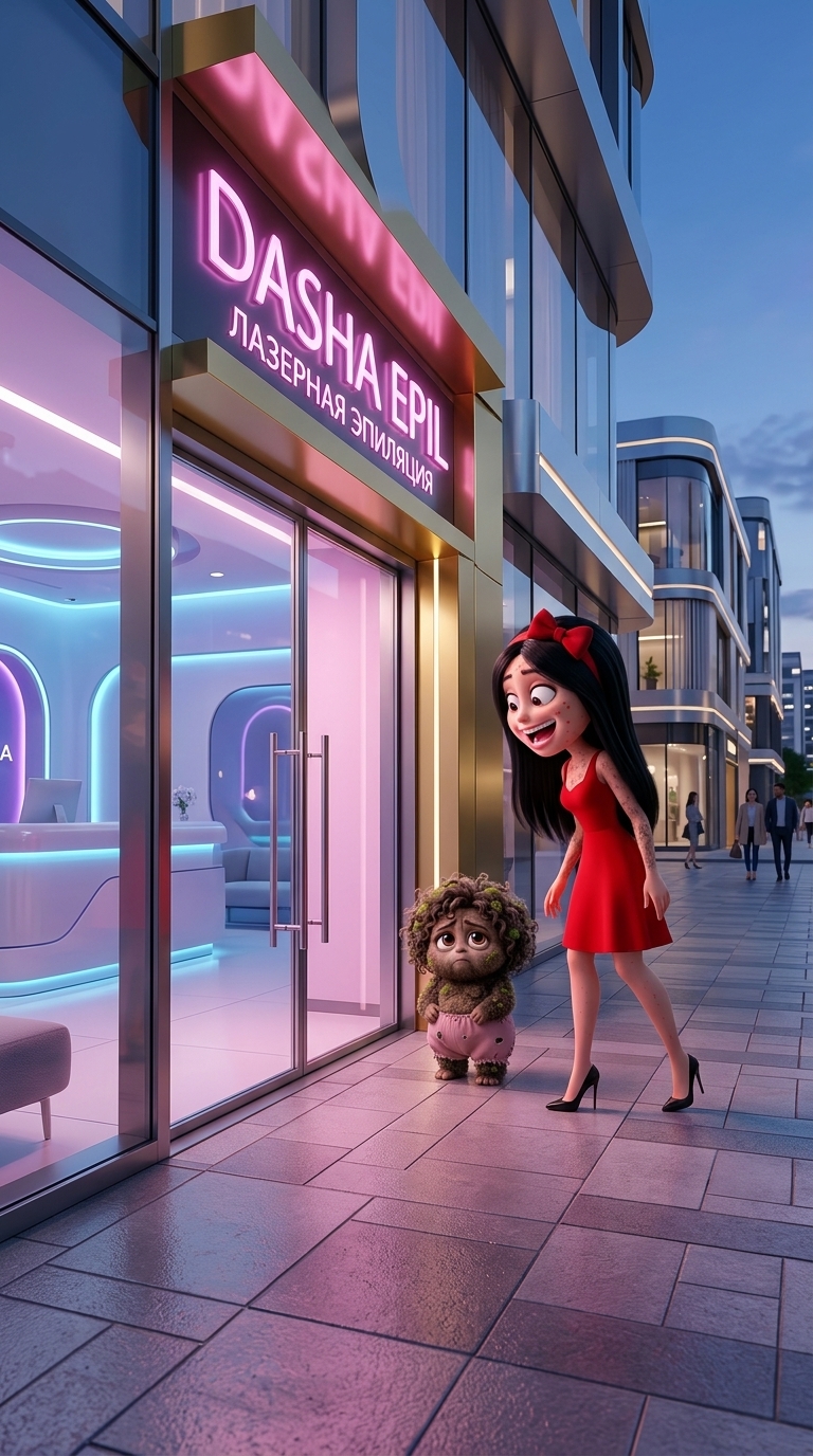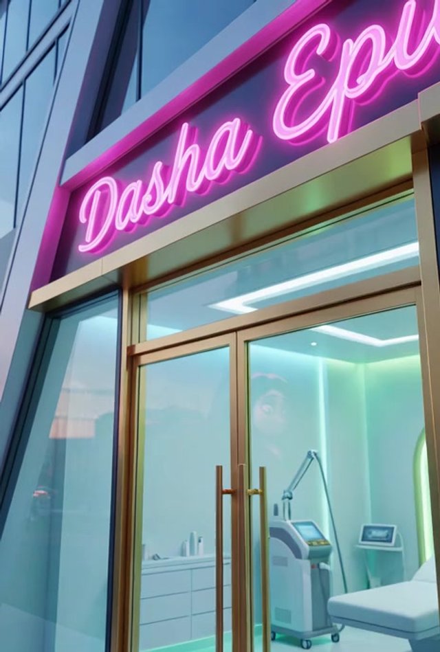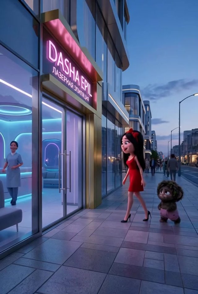 Strong rule: style --- 3D Pixar ---. Фасад современной и стильной студии 'Dasha Epil'. Вход оформлен стильной розовой неоновой вывеской и...