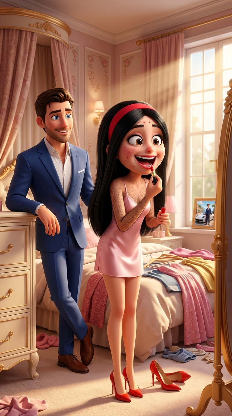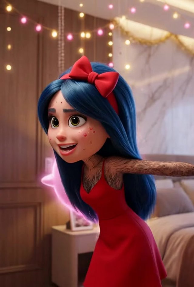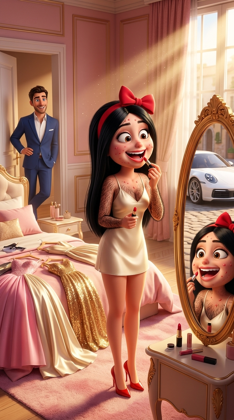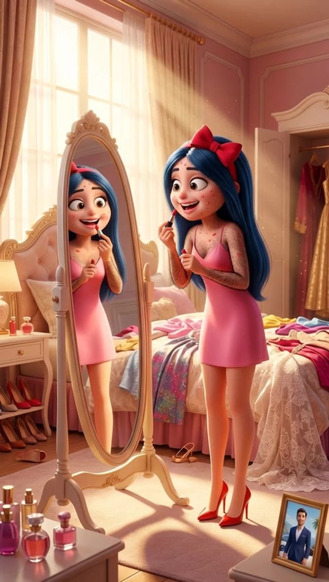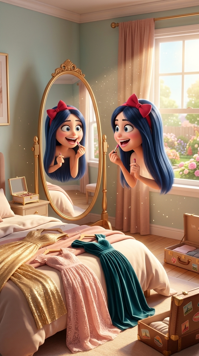 Strong rule: style --- 3D Pixar ---. Яркая и солнечная спальня в стиле Pixar. Вагинесса стоит перед большим овальным зеркалом, нанося пом...