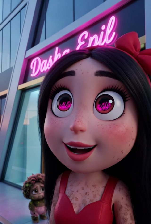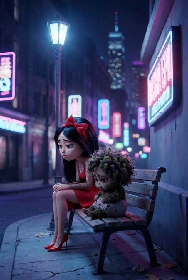 Strong rule: style --- 3D Pixar ---. Ночная городская улица, освещенная неоновыми вывесками. Вагинесса сидит на скамейке в красном платье...
