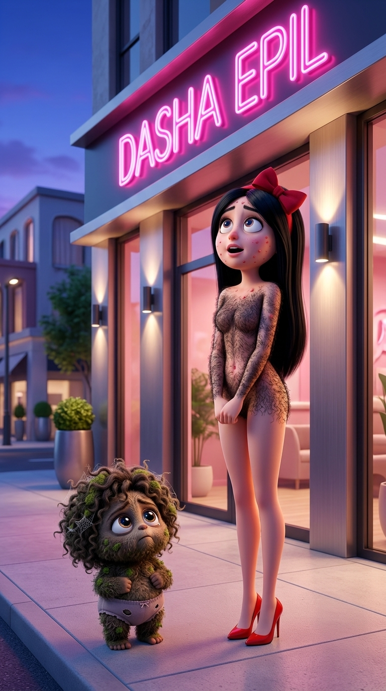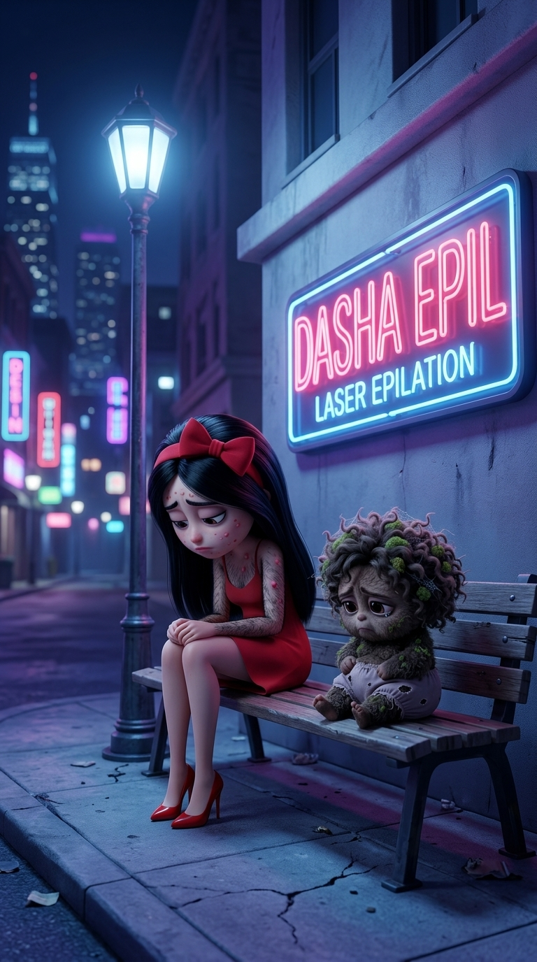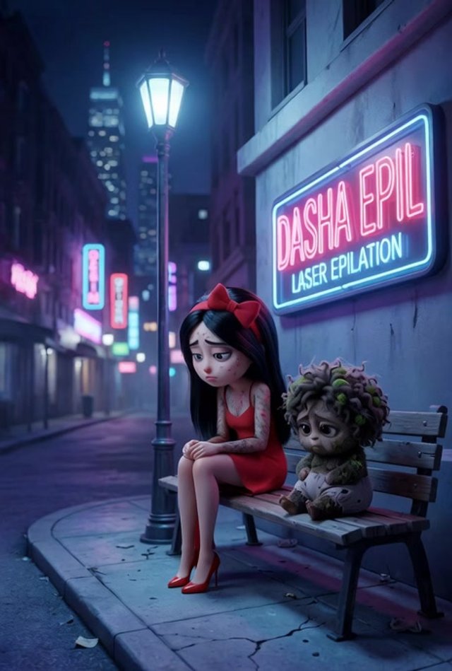 Strong rule: style --- 3D Pixar ---. Ночная городская улица, освещенная неоновыми вывесками. На вывески написано DASHA EPIL Вагинесса сид...