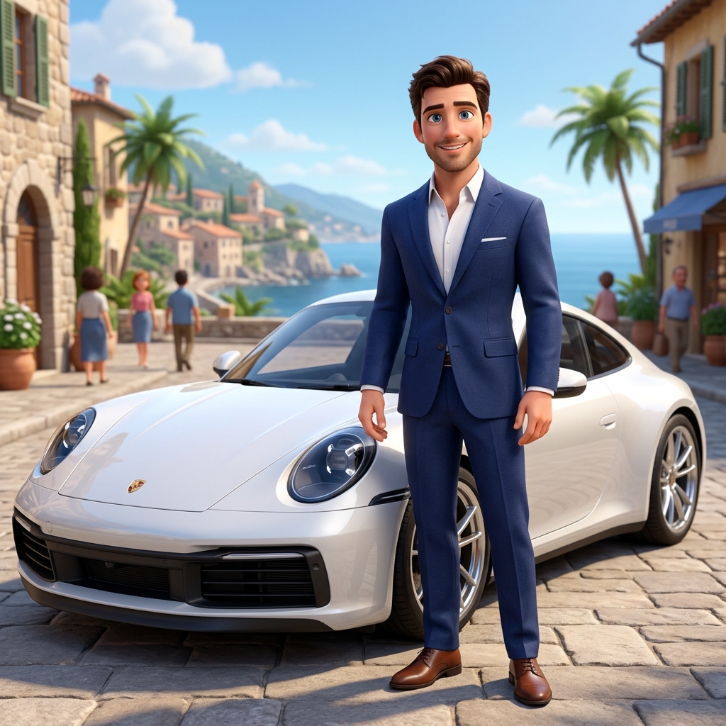 Strong rule: style --- 3D Pixar ---. брюнект красиввый с голубыми глазами в стиле пиксар в костюме пиджак и брюки и белый авто порше
