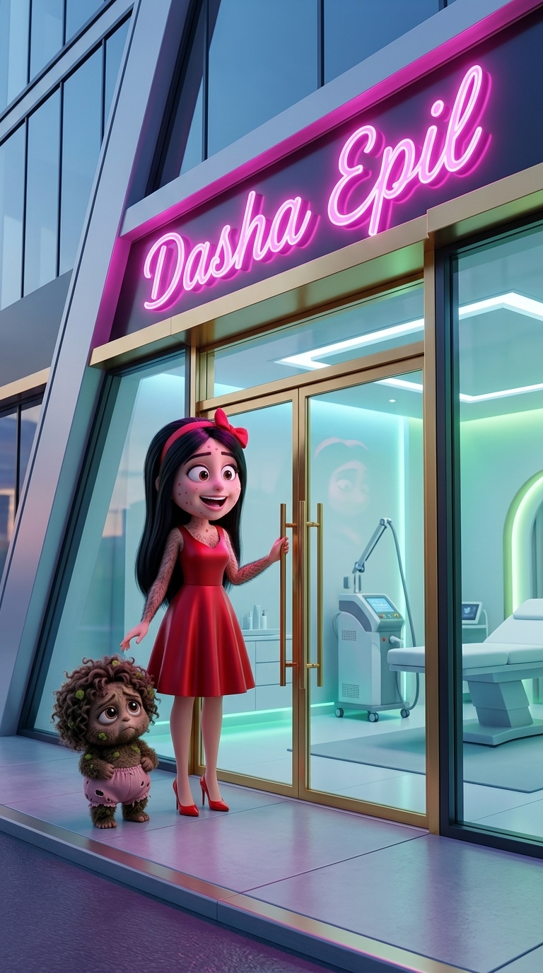 Strong rule: style --- 3D Pixar ---. Pixar-style animation, high detail. Vaginessa stands in front of a glowing, stylish laser hair remov...