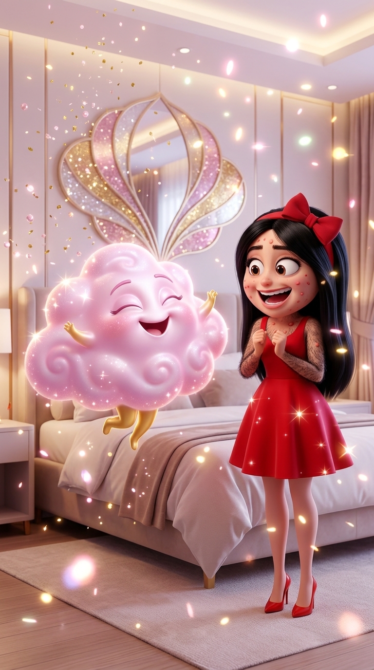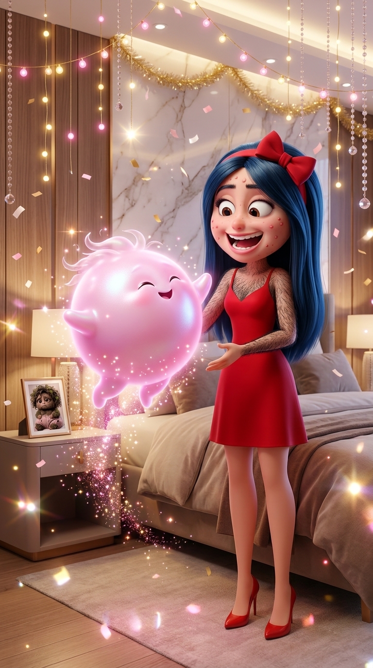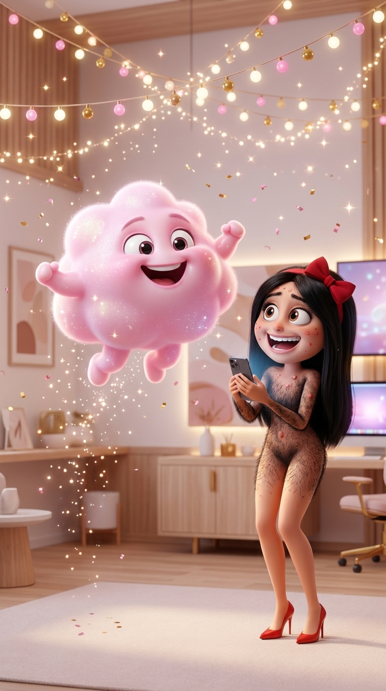 Strong rule: style --- 3D Pixar ---. Финальная сцена трансформации. Матильда теперь выглядит как идеально гладкое, сияющее розовое облачк...