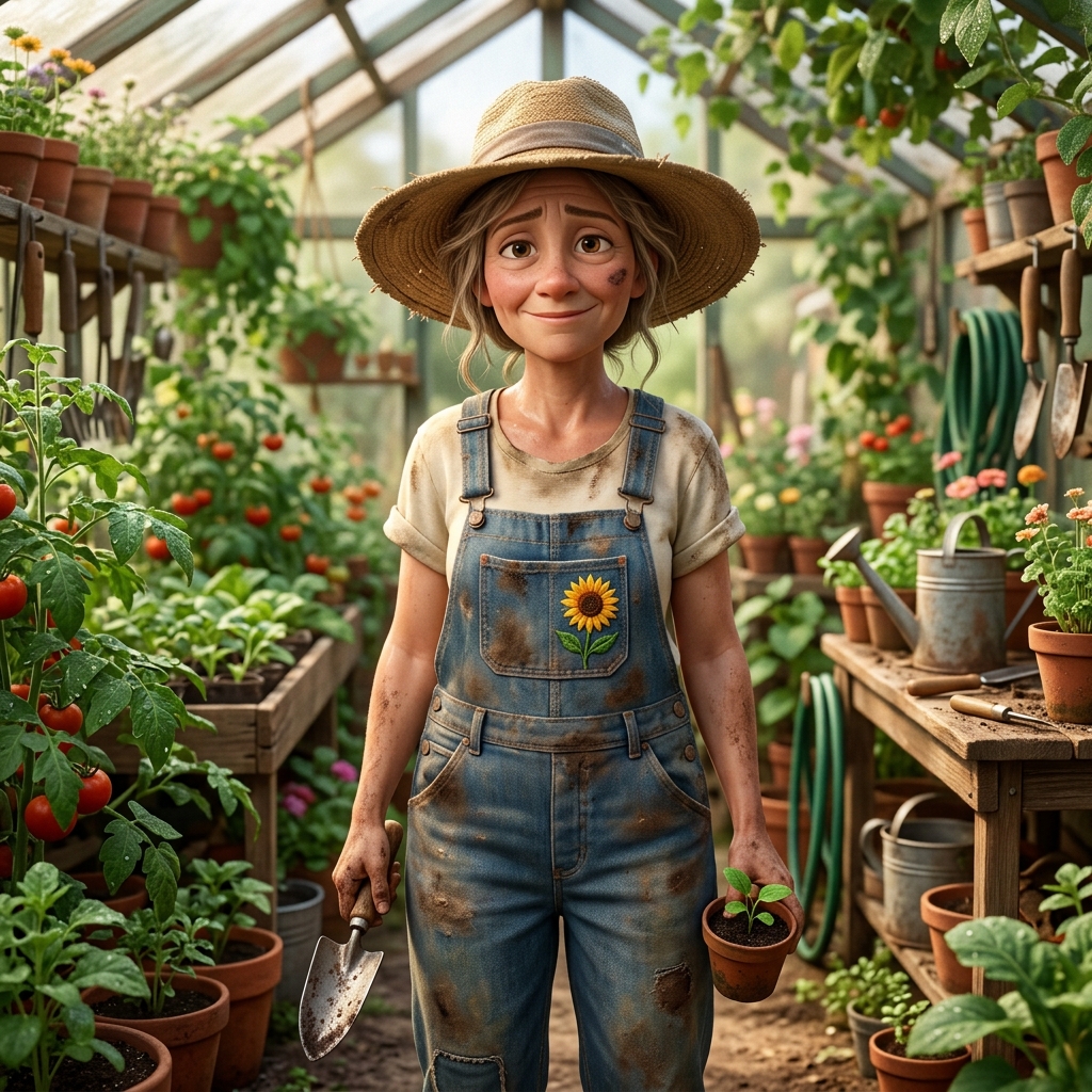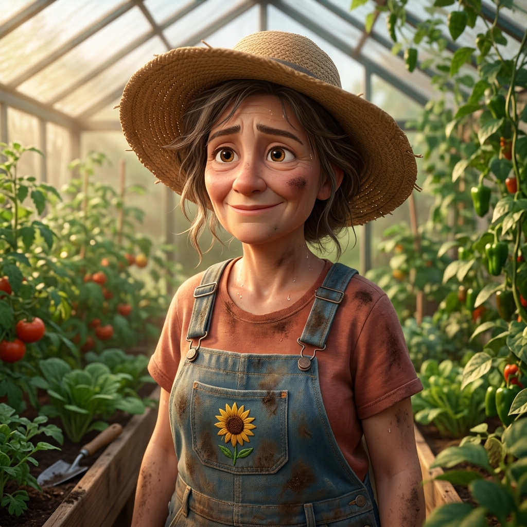 Strong rule: style --- 3D Pixar ---. Стиль анимации Pixar, 3D-рендер высокого качества. Женщина около 45 лет с добрым, но измученным лицо...