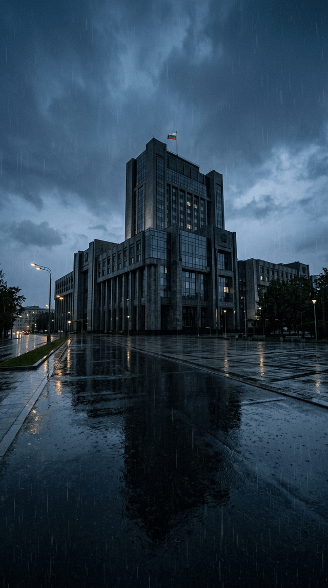 Кинематографический реализм. Внушительное, современное правительственное здание в Москве в сумерках. Идет ...
