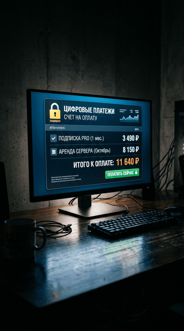Кинематографический реализм. Крупный план компьютерного монитора в тёмной комнате. На экране виден цифрово...