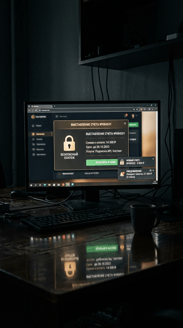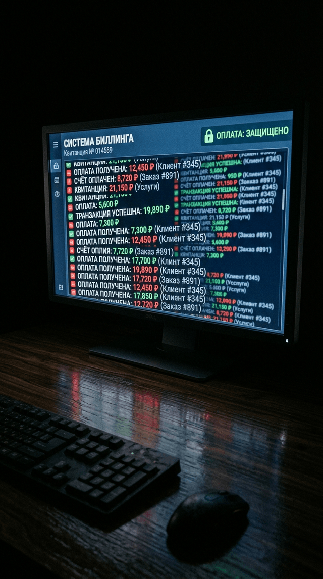 Медленное панорамирование по столу, фокусируясь на светящемся мониторе. Экран едва заметно мерцает, подчёркивая цифровую природу угрозы.
