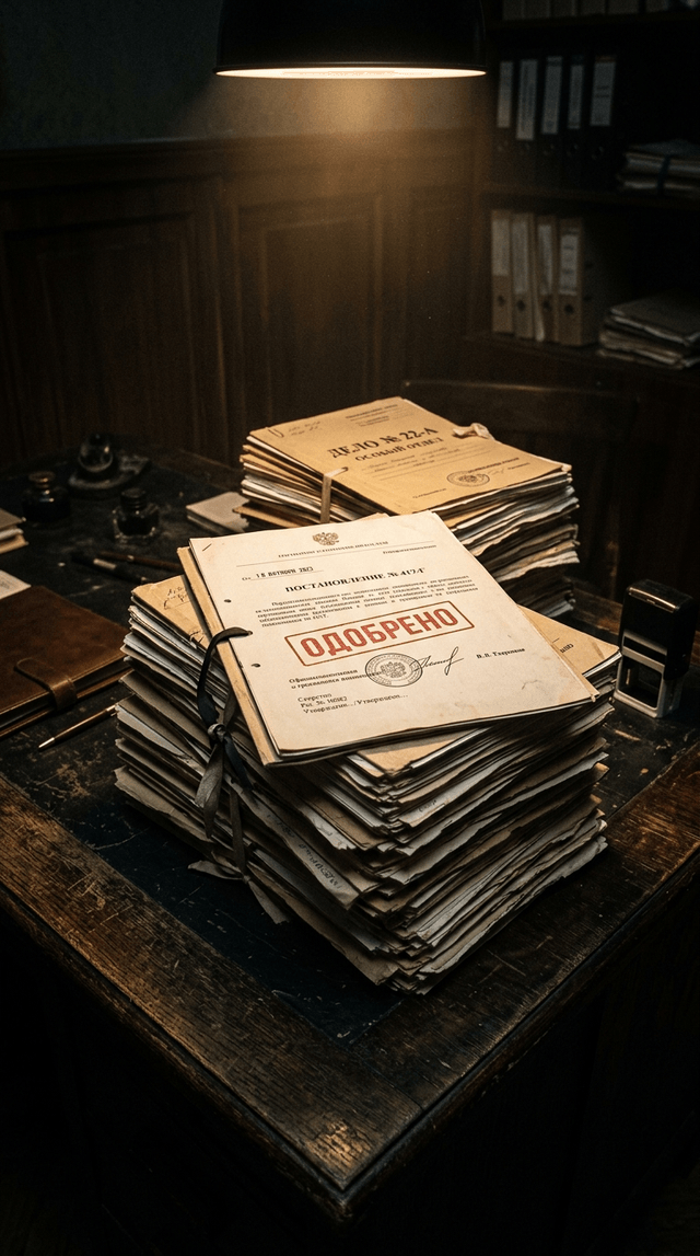 Медленный перевод фокуса от переднего края стола к красному штампу «ОДОБРЕНО». Пылинки парят в кинематографическом световом луче.