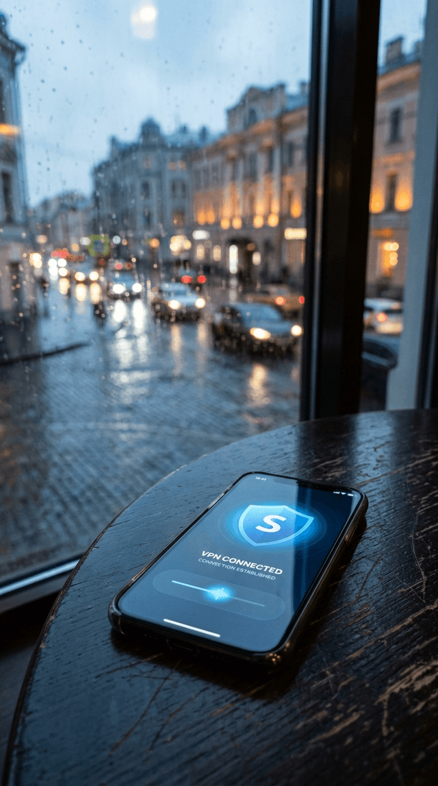 Плавный, медленный наезд камеры, фокусирующийся на экране телефона. Зеленый щит пульсирует, указывая на безопасное соединение. Синий зна...