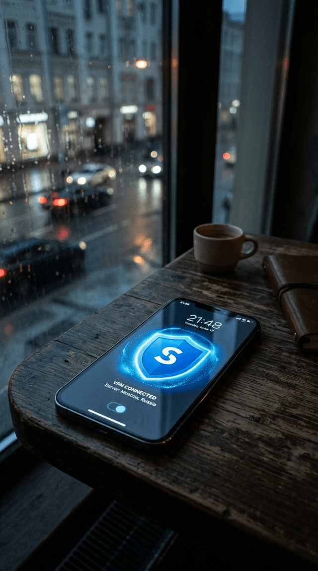 Кинематографический реализм. Смартфон лежит на столе, на экране отображается приложение VPN(эмлема щита со...