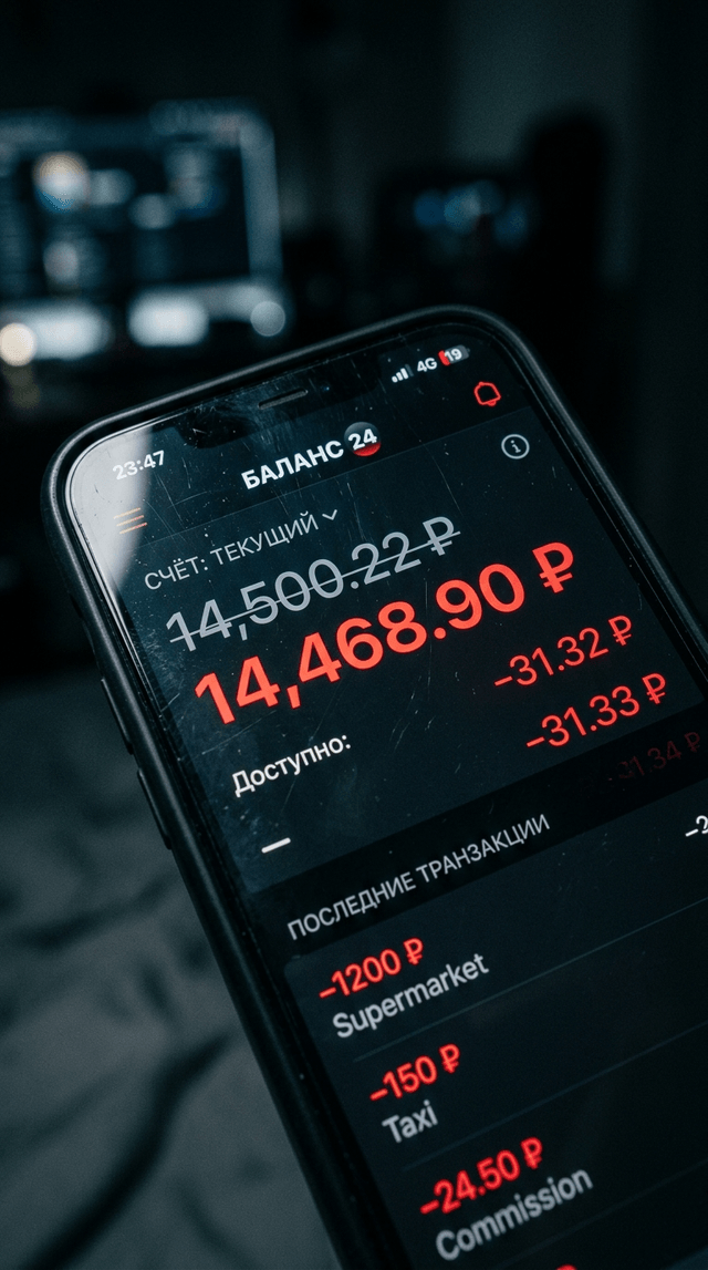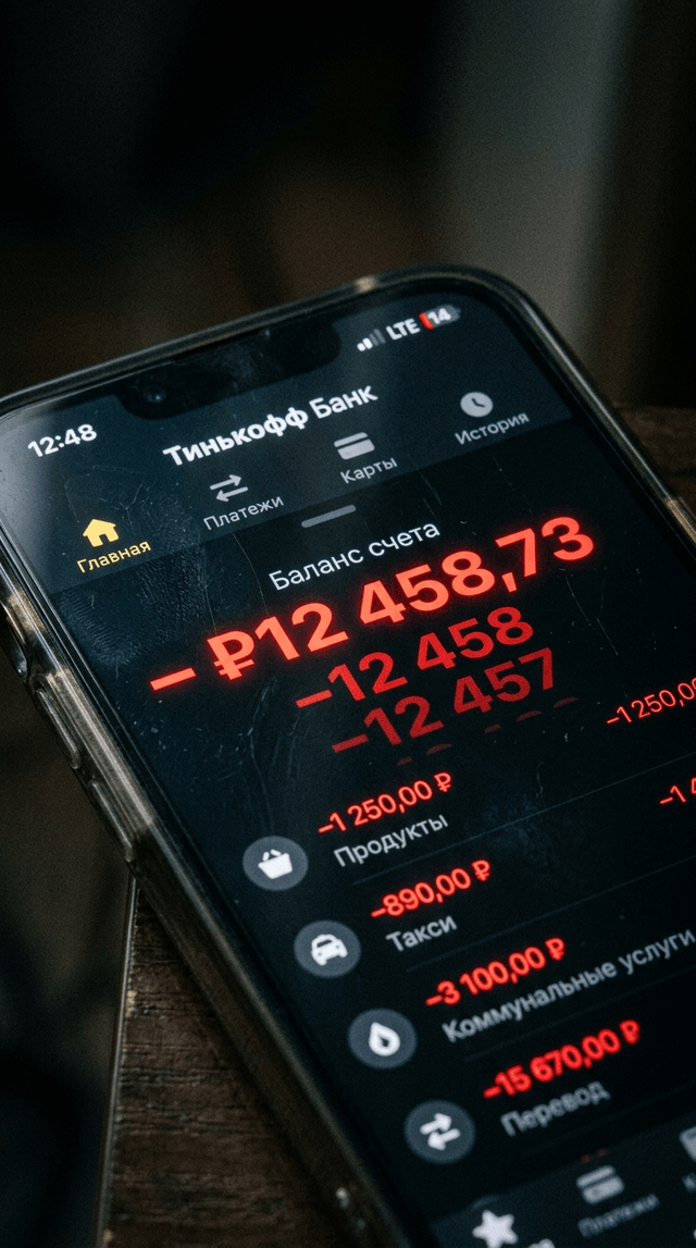 Цифры на экране быстро мелькают. Камера медленно наезжает на уменьшающийся баланс.