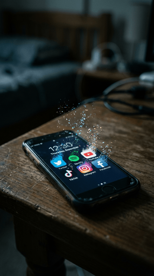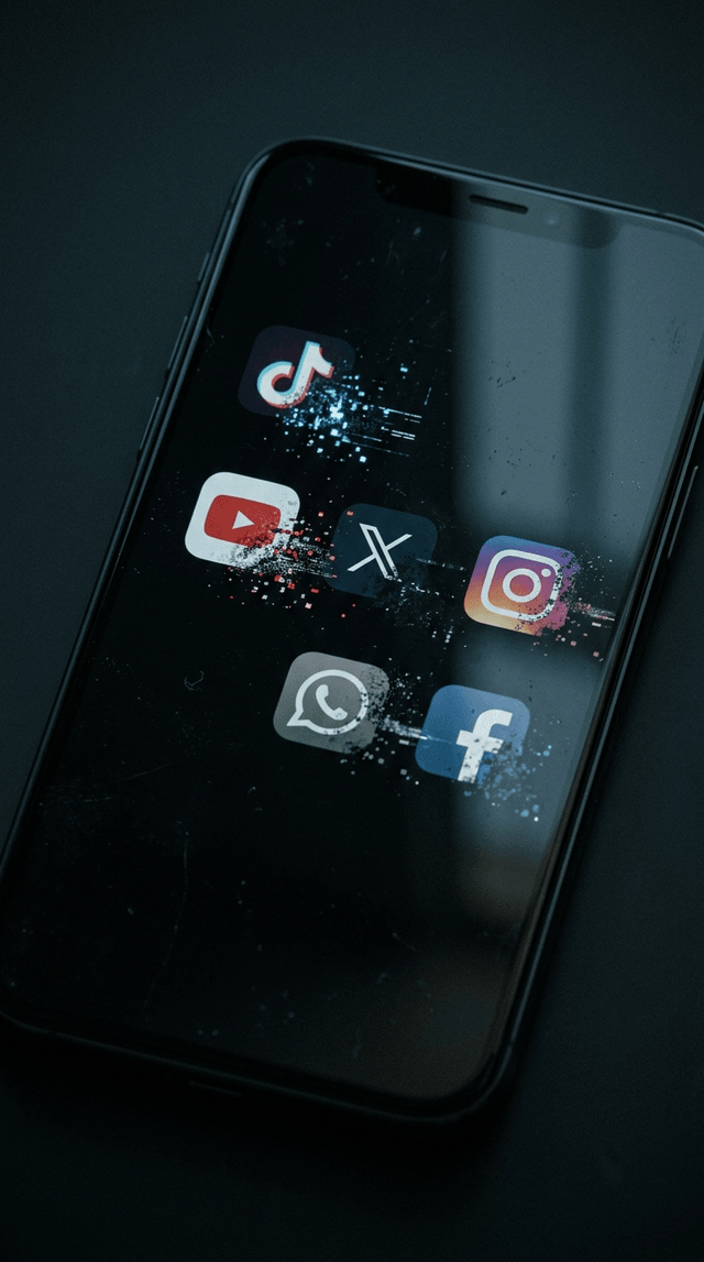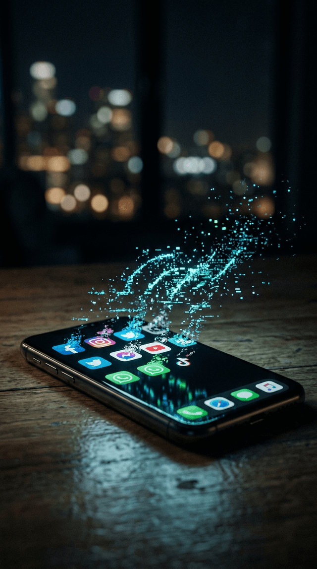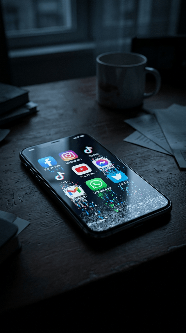Кинематографический реализм. Темный экран смартфона, на котором значки популярных глобальных приложений ме...