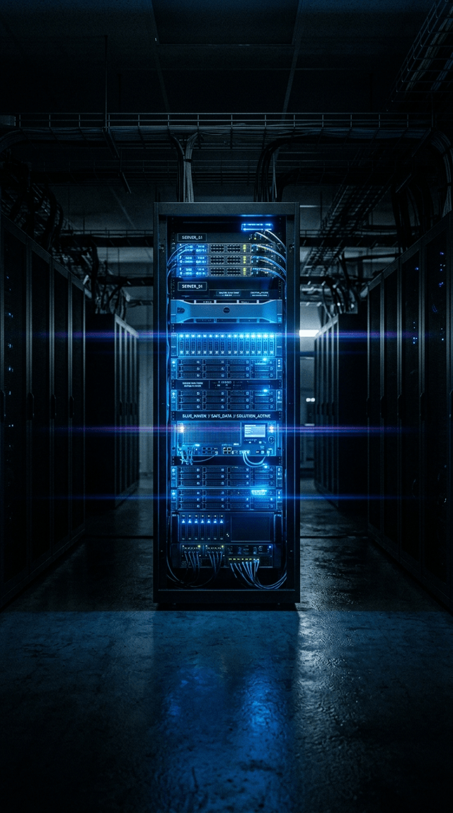 Медленный наклон вверх от тёмного пола, чтобы показать светящуюся синим серверную стойку. Синий свет пульсирует ровно и успокаивающе.