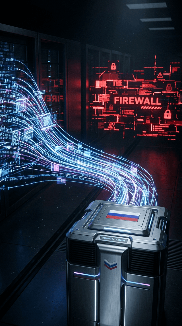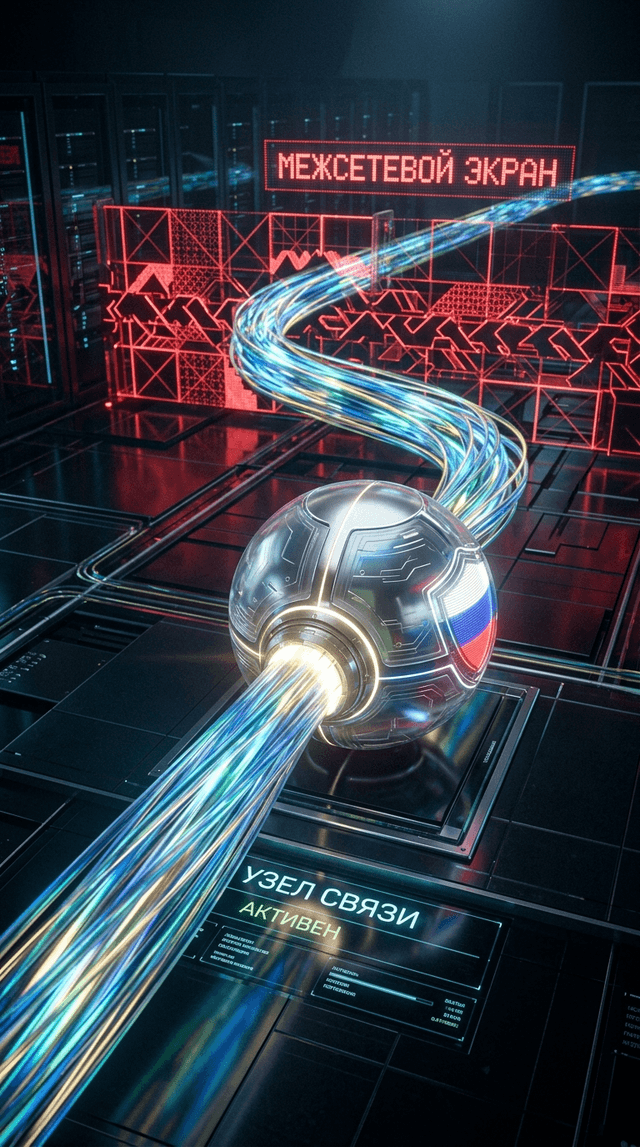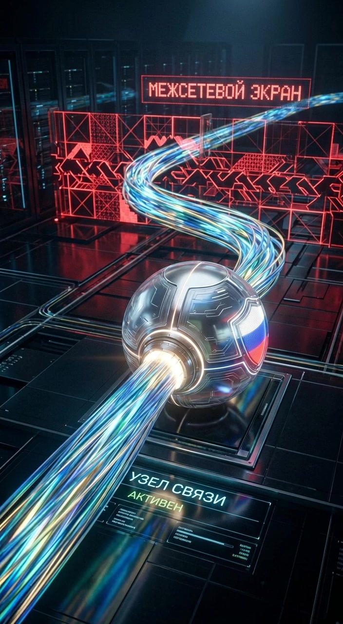 Динамический пролет камеры, следующий за светящимся потоком данных, маршрутизирующимся через защищенный российский узел и обходящим красн...