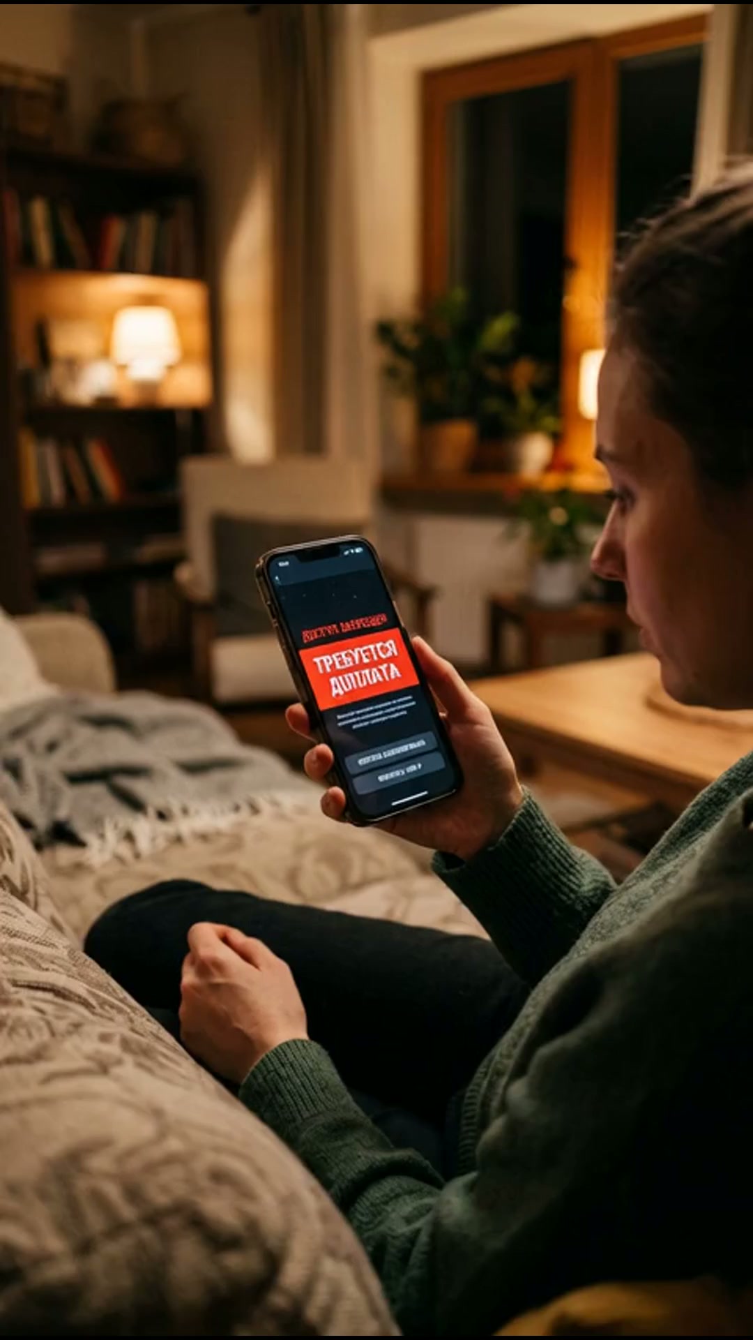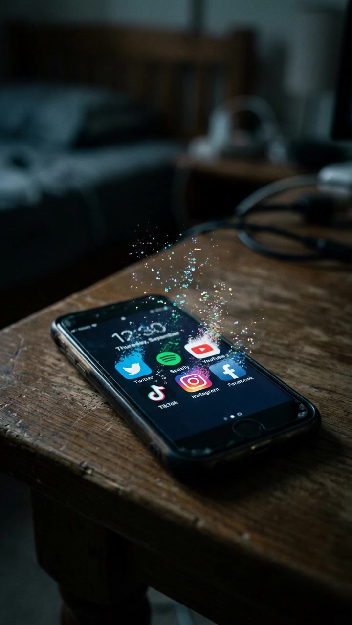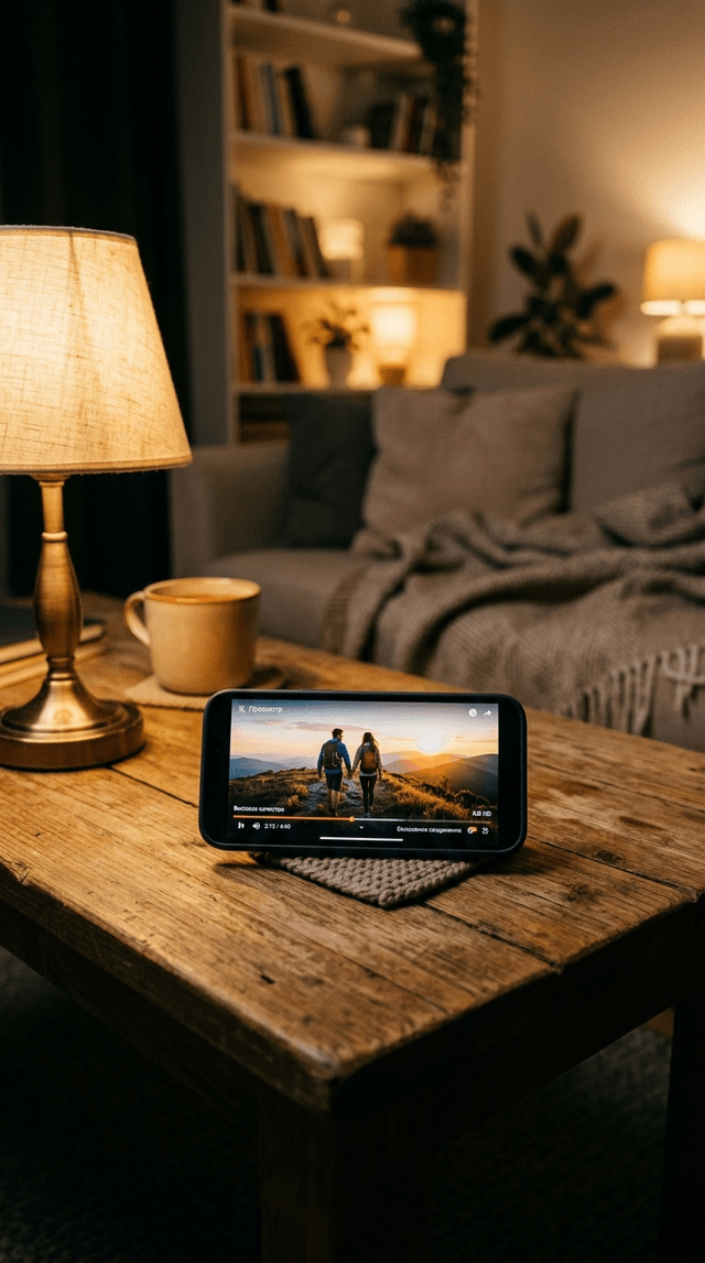 Кинематографический реализм. Смартфон лежит на уютном столике в гостиной, плавно воспроизводя высококачест...