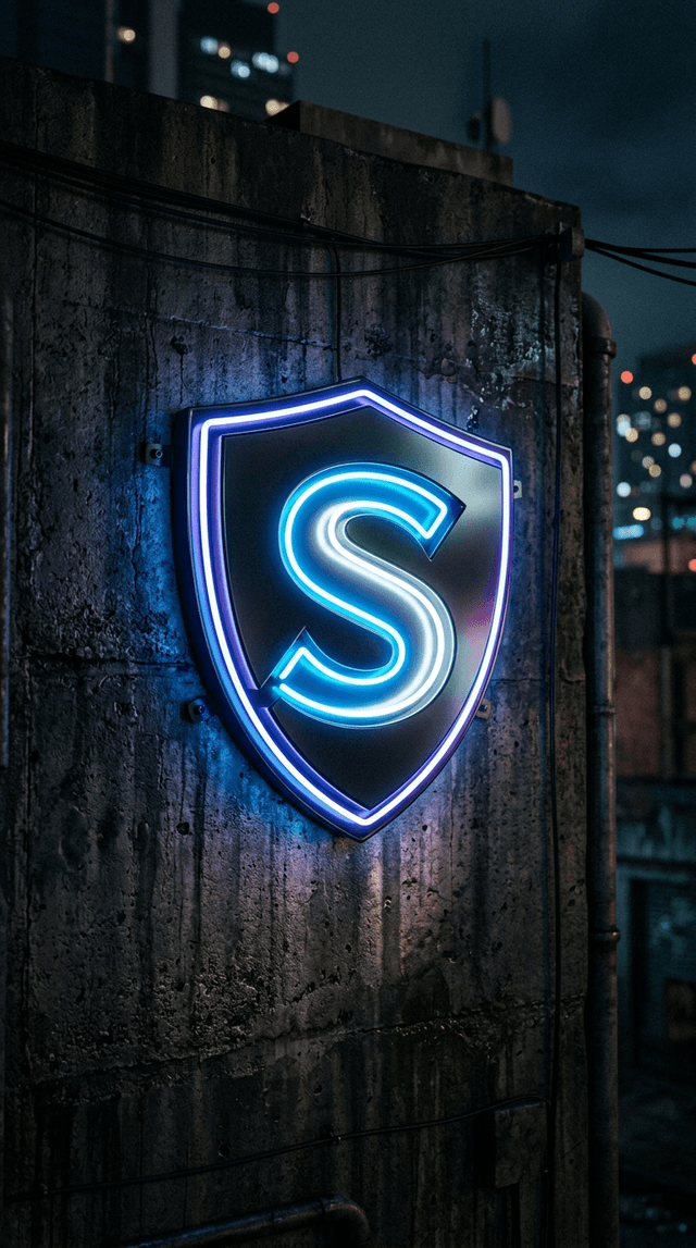 Кинематографический реализм. Гладкий, светящийся неоновый щит с логотипом S на фоне тёмной, текстурированн...