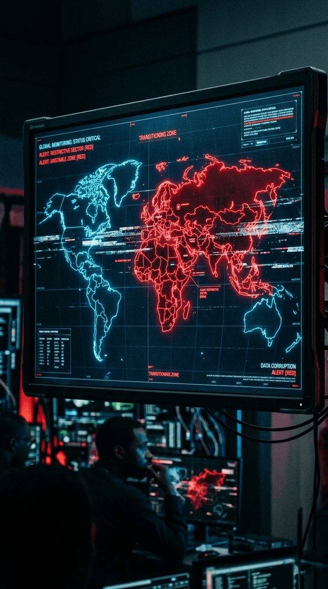 Камера резко наезжает на светящуюся цифровую карту мира, пока потоки данных внезапно меняют цвет с зеленого на тревожный красный. Эффект ...
