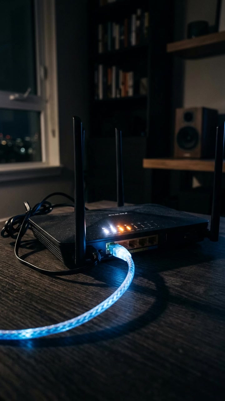 Кинематографический реализм. Светящийся кабель Ethernet, воткнутый в изящный домашний интернет-роутер в тё...