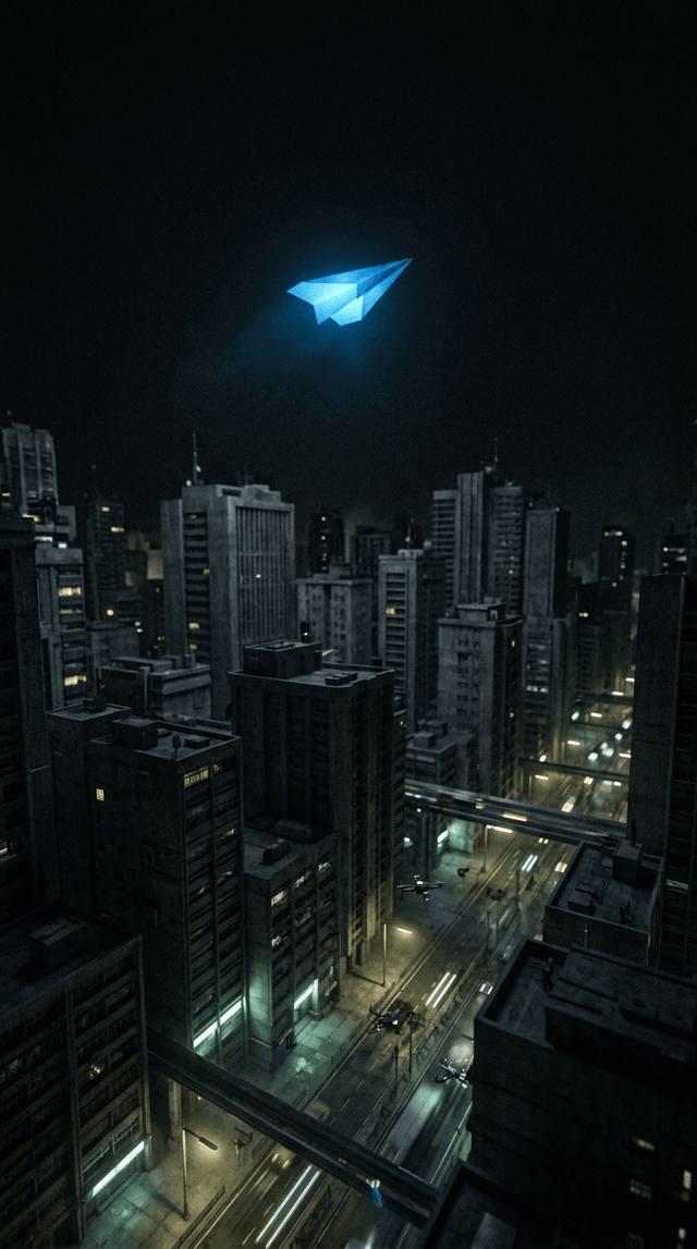 Светящийся бумажный самолетик плавно скользит вверх, оставляя темный, суровый город далеко позади в тенях.