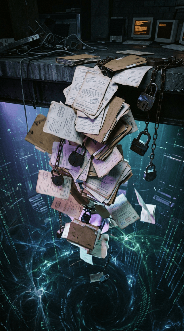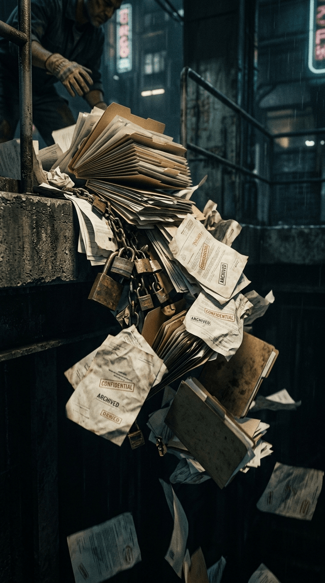 Замедленная съемка того, как документы и замки кувыркаются вниз в темную бездну.
