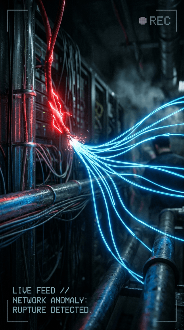 Быстрое, динамичное расширение светящихся синих сетевых узлов, мгновенно появляющихся после того, как красный узел гаснет.