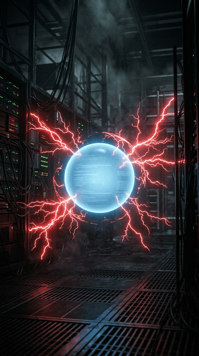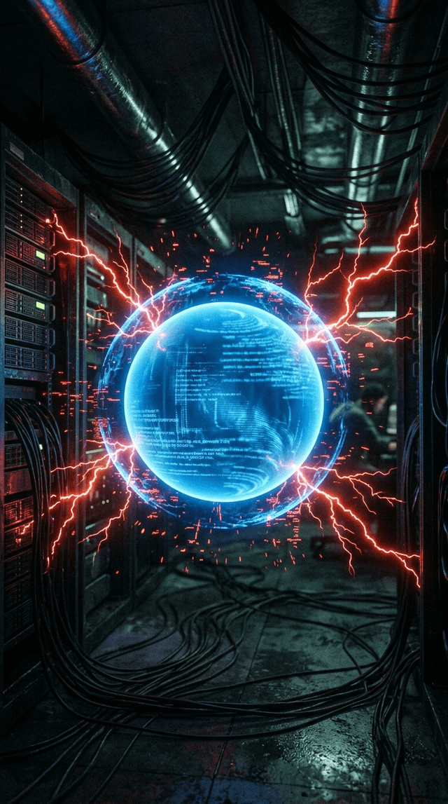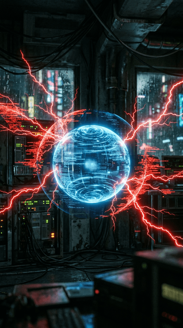 Синяя сфера мягко вращается, излучая спокойный свет, в то время как красные помехи агрессивно, но тщетно мерцают вокруг неё.