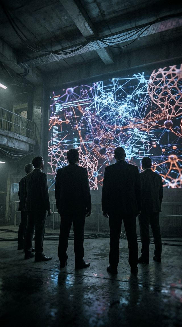 Кинематографический реализм, темные силуэты мужчин в строгих костюмах, ст...