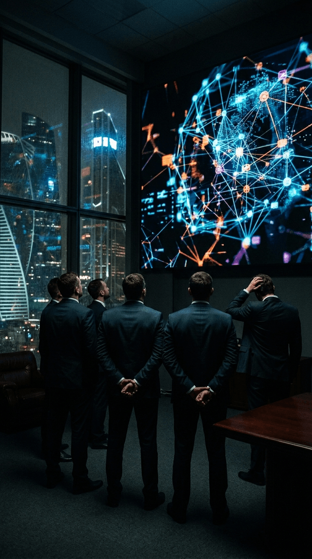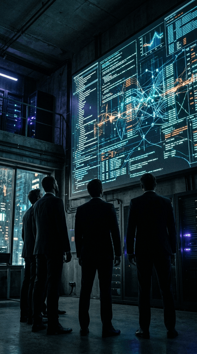 Медленный проезд камеры мимо светящихся мониторов, фокус переходит с одного экрана на другой, драматичная корпоративная атмосфера.
