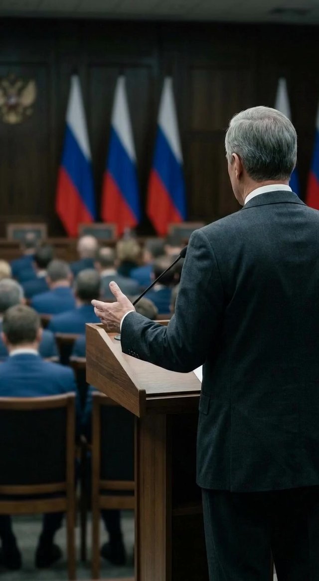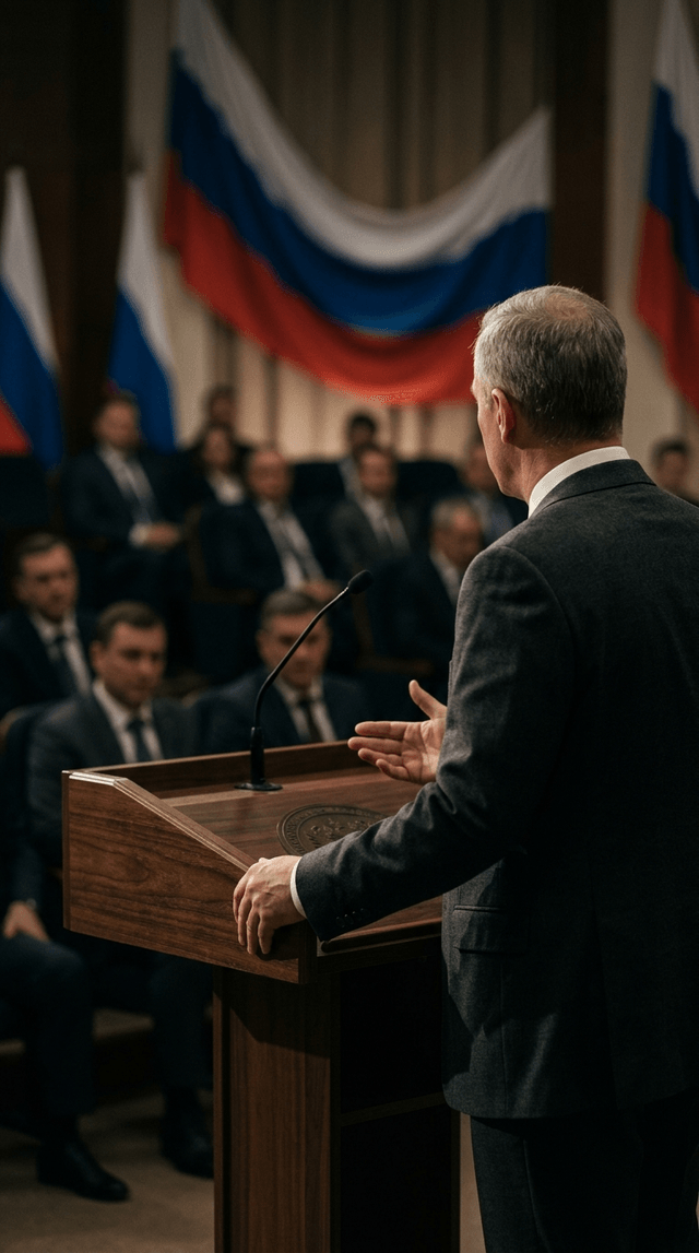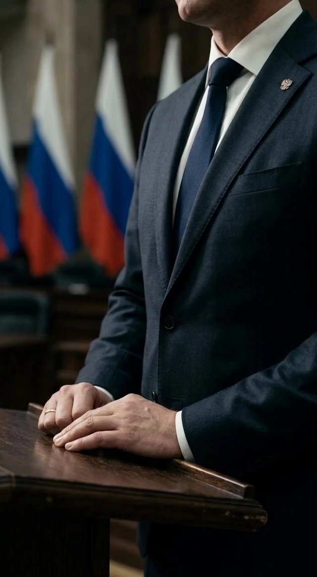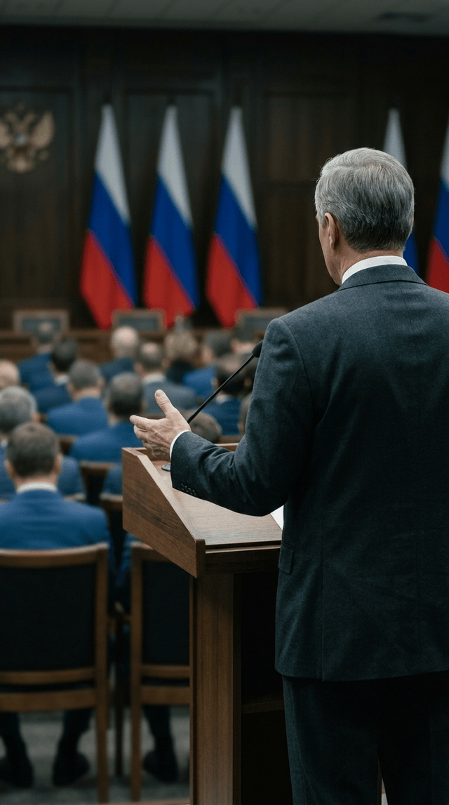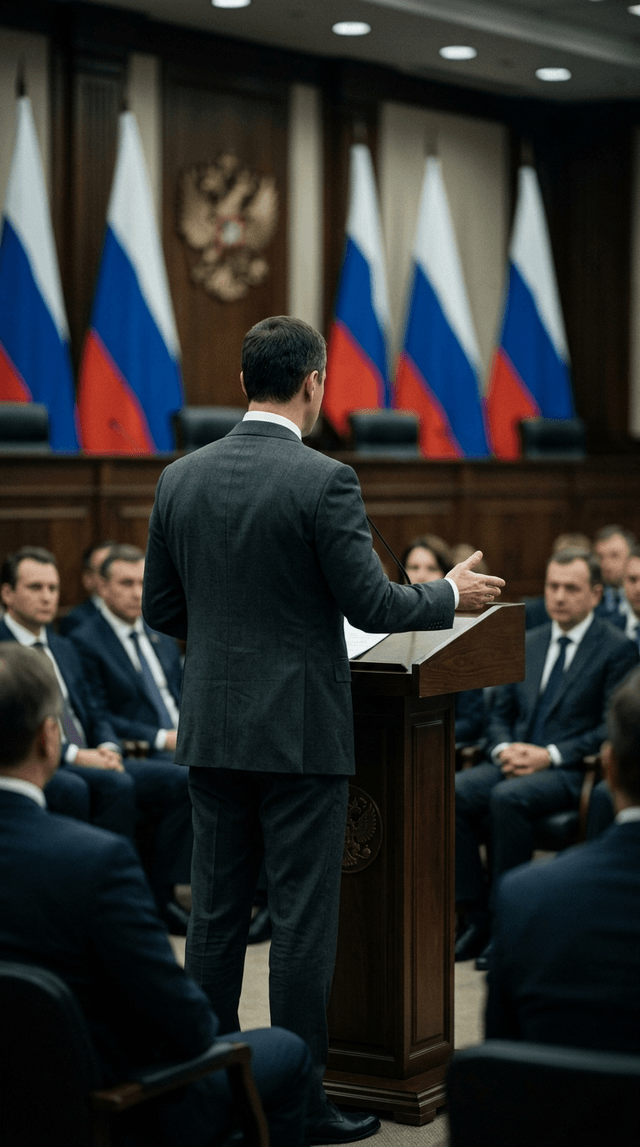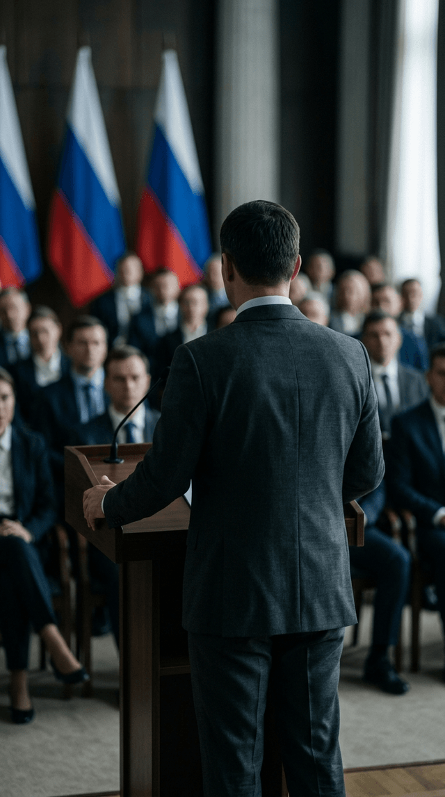 Медленное панорамирование по трибуне, фокус камеры остается зафиксированным на костюме и руках чиновника, плавное кинематографическое дви...