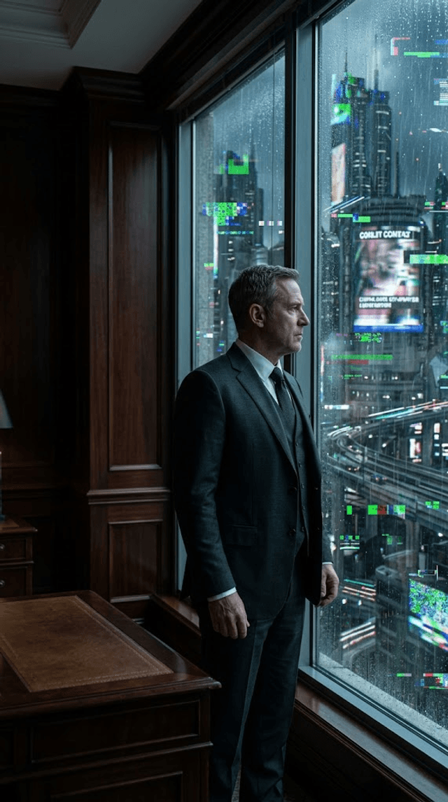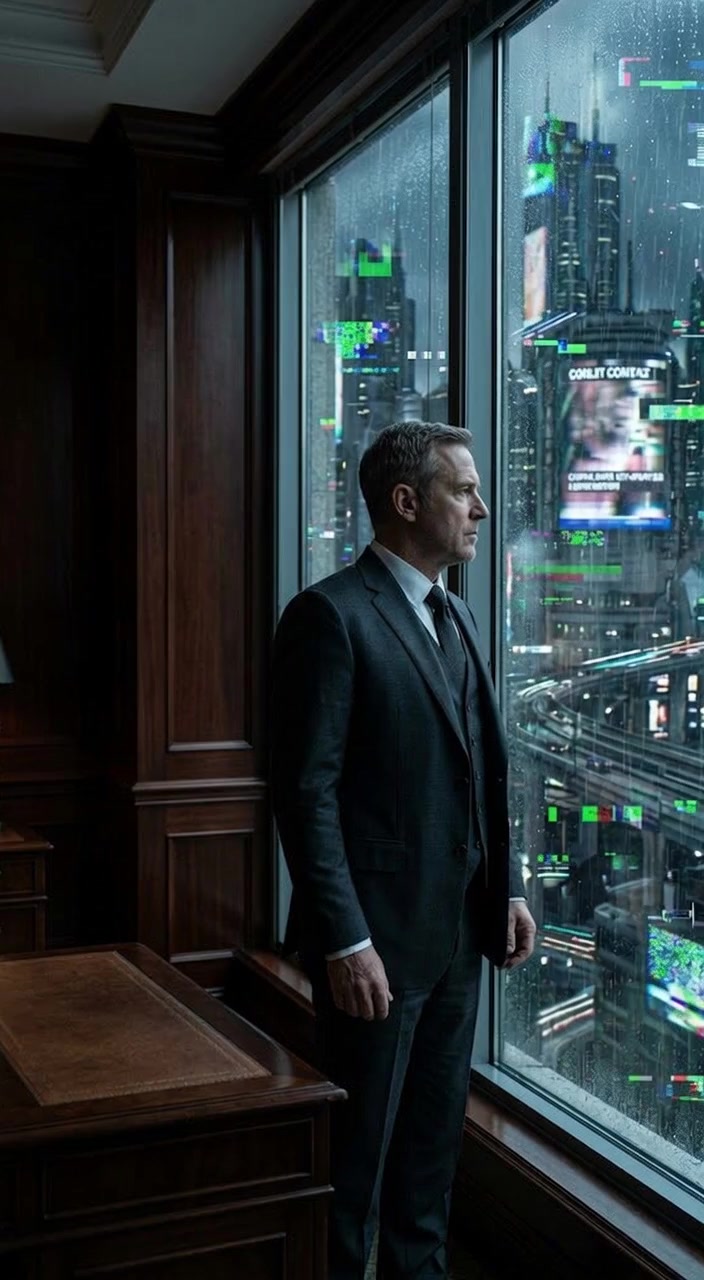 Камера медленно наезжает на бесстрастное лицо чиновника, в то время как городские огни снаружи начинают мерцать и распадаться на пиксели....