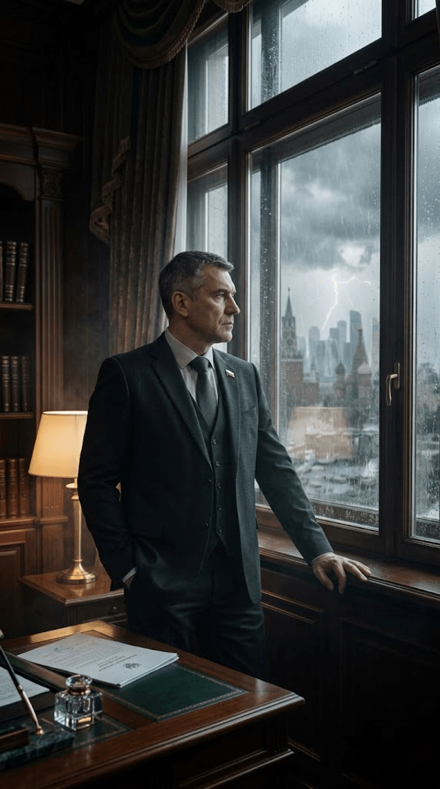 Камера медленно наезжает на бесстрастное лицо чиновника, через окно открывается вид на Москву с мрачной погодой