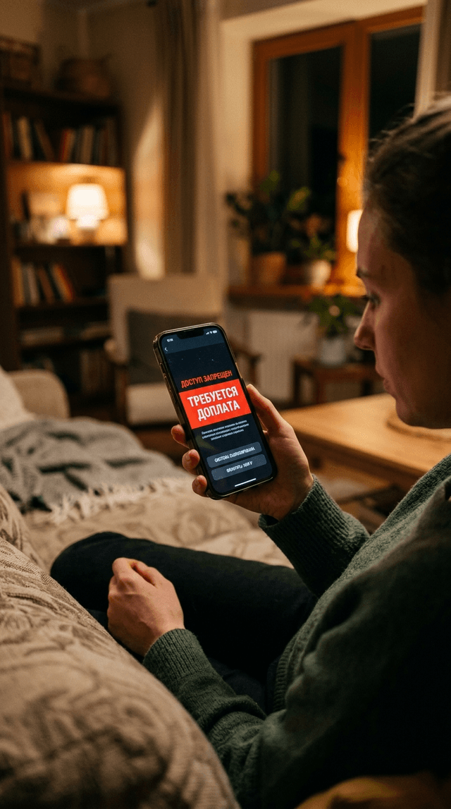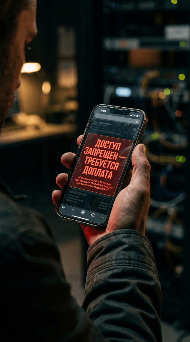 Кинематографический крупный план экрана высокотехнологичного смартфона, отображающего ярко-красное предупр...