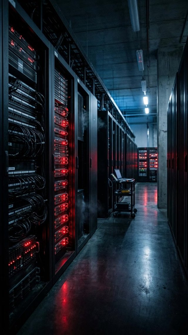 Медленное панорамирование по бесконечным рядам внушительных серверных стоек, подчеркивающее их масштаб и холод.