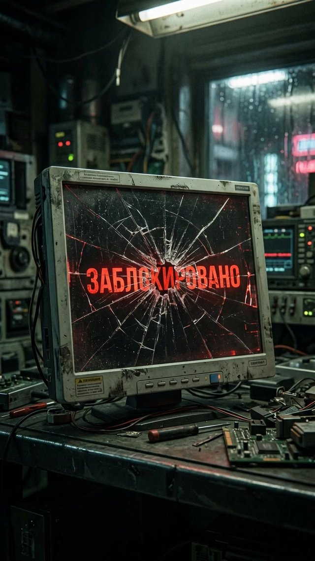 Кинематографический реализм, разбитый экран компьютера, отображающий крас...