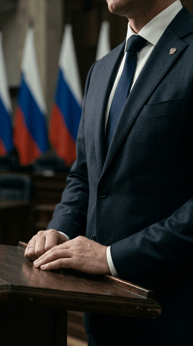 Медленное панорамирование по трибуне, фокус камеры остается зафиксированным на костюме и руках чиновника, плавное кинематографическое дви...
