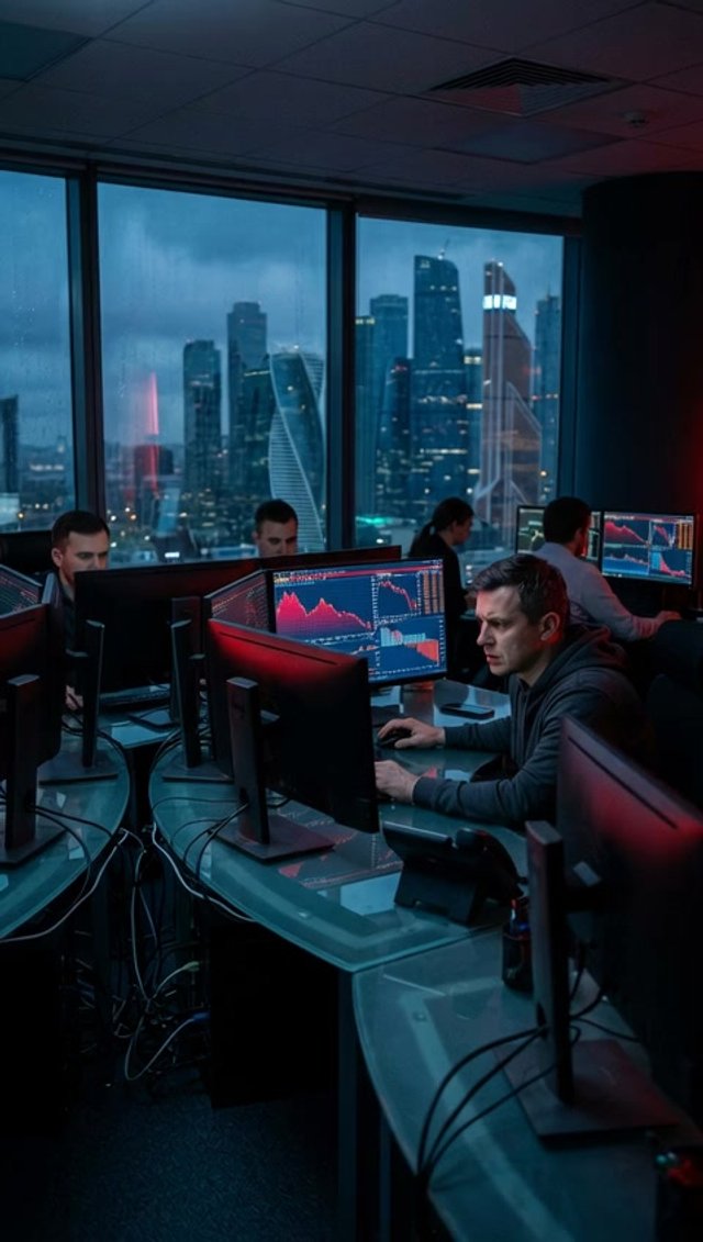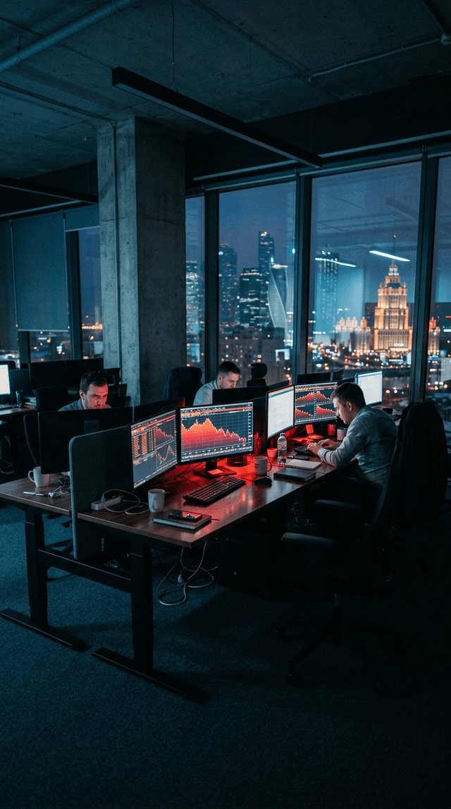 Медленный проезд камеры мимо светящихся мониторов, фокус переходит с одного экрана на другой, драматичная корпоративная атмосфера.