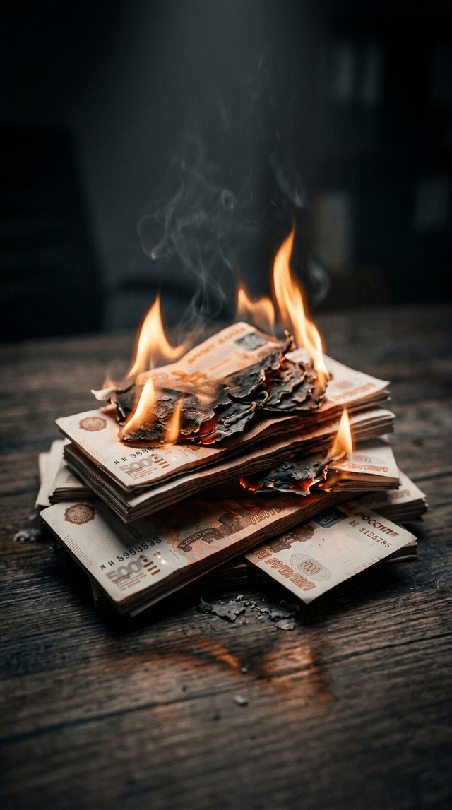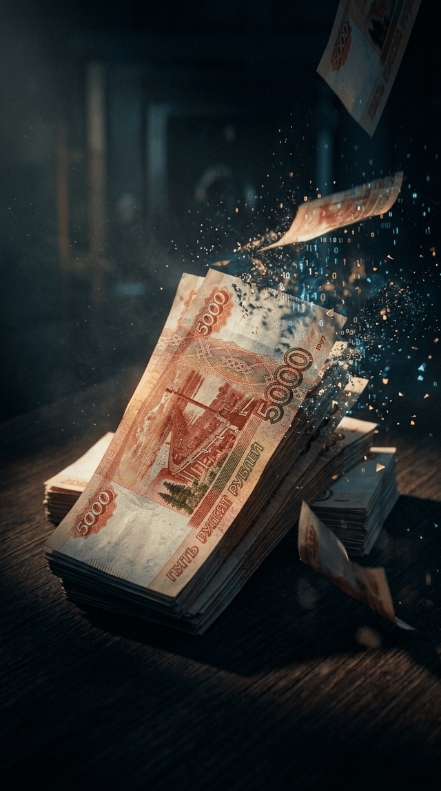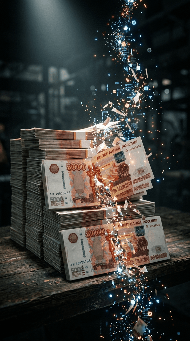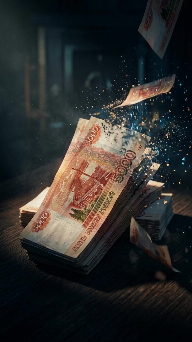 Кинематографический макрокадр стопок 5000-рублевых банкнот, драматический...