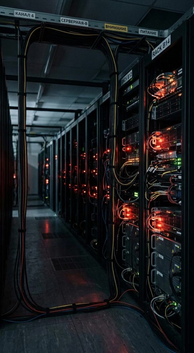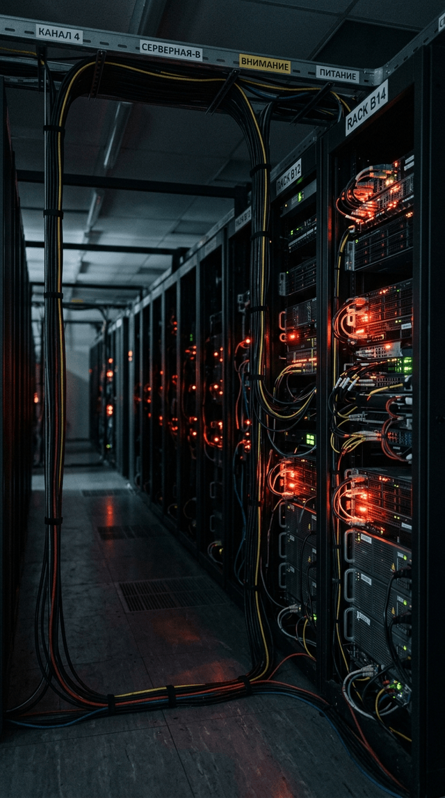 Ряды массивных, тёмных серверных стоек в российском дата-центре, мигающие...