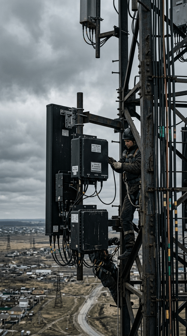 Подъем камеры вдоль холодной металлической конструкции телекоммуникационной вышки, заканчивающийся на черных ящиках с оборудованием.