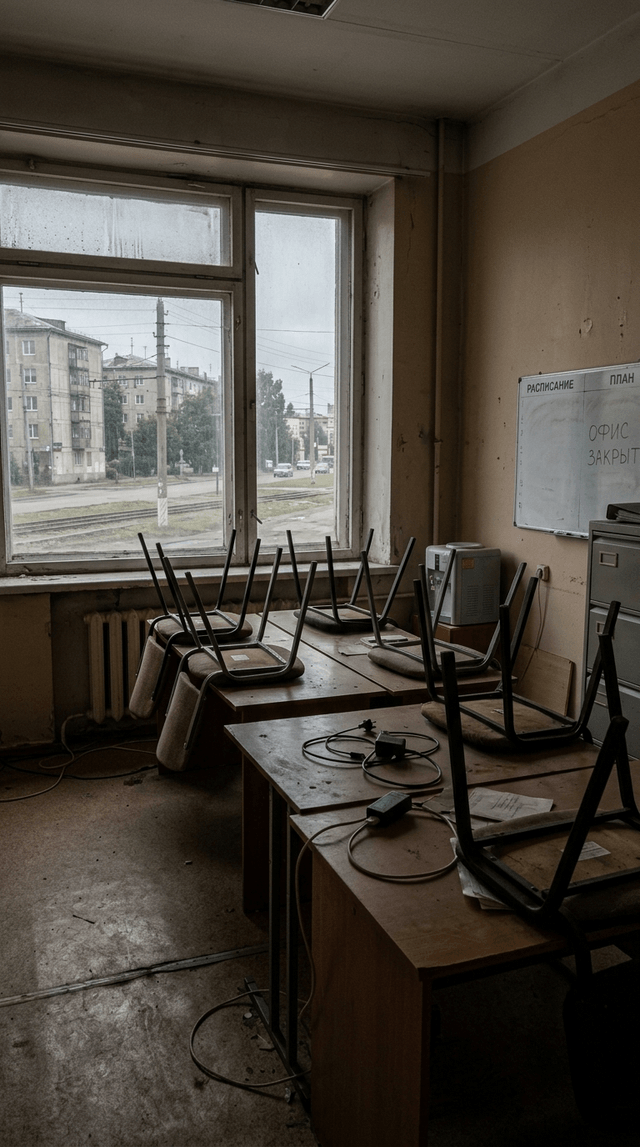 Пустой, закрытый офис малого бизнеса в российском городе, стулья, сложенн...