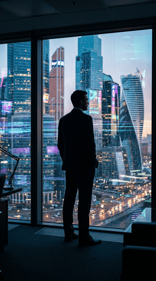 Кинематографический перевод фокуса от силуэта мужчины к сбоящему, хаотичному отражению в оконном стекле.