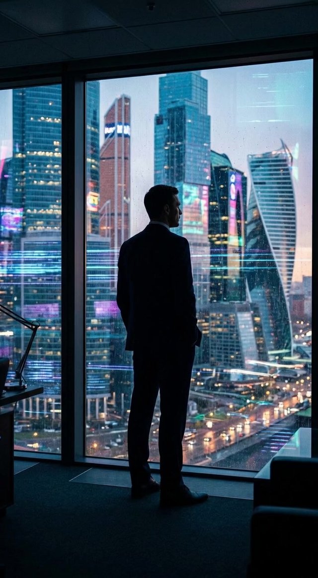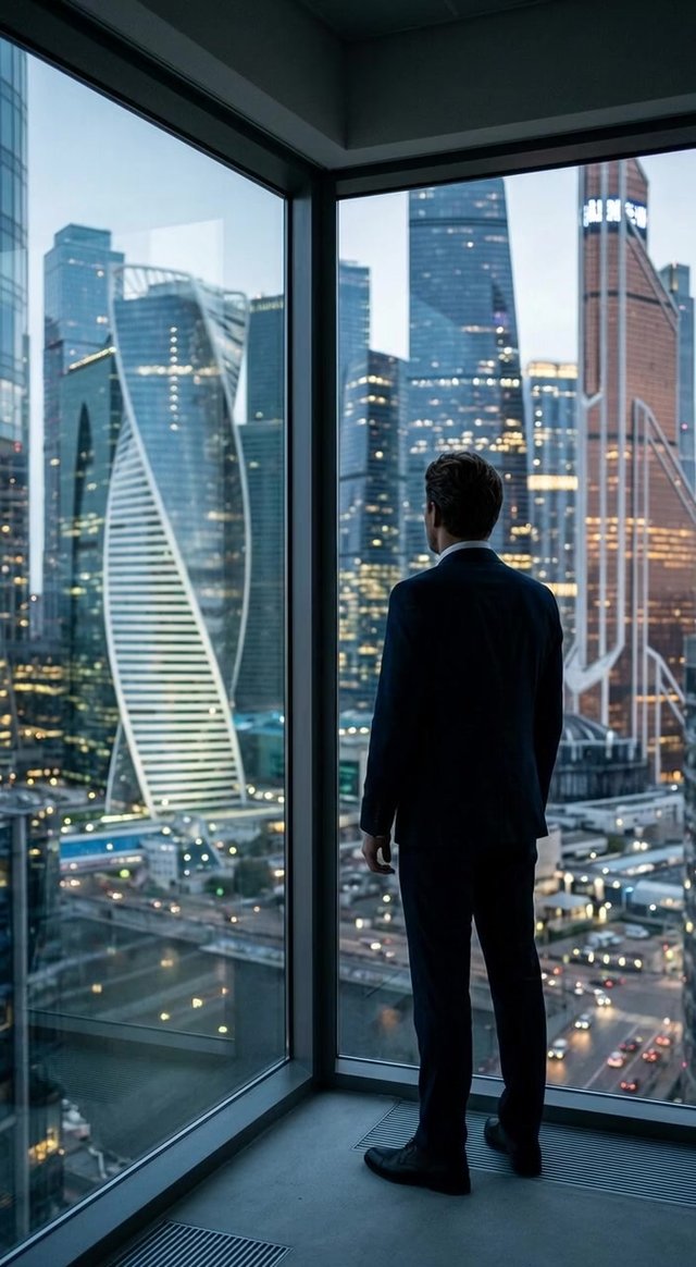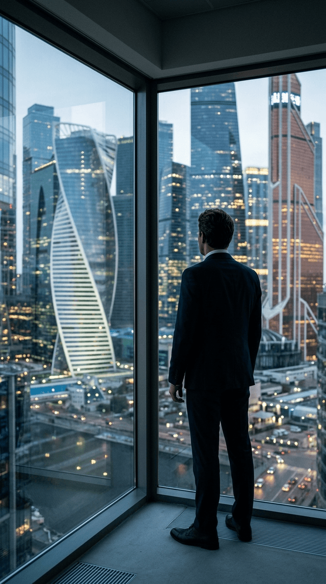 Силуэт мужчины в костюме, смотрящего в окно высотного здания в Москва-Сит...
