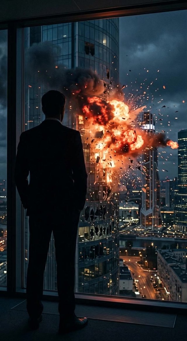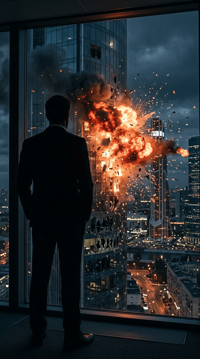 медленное приближение камеры. Один из этажей здания на которое смотрит человек взрывается, но человек продолжает также молча смотреть.
