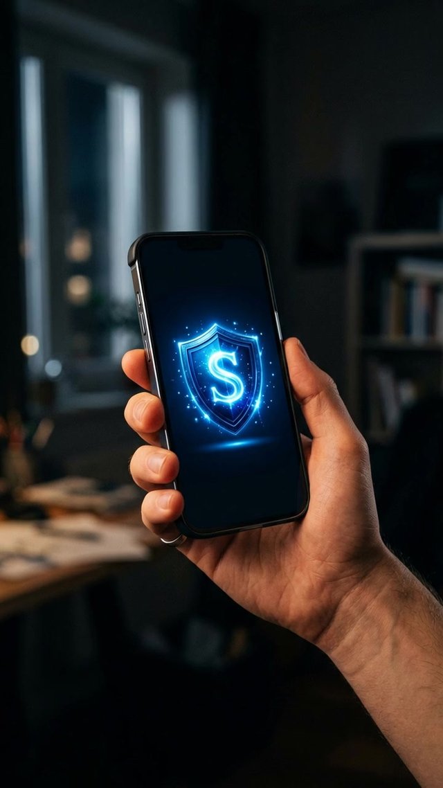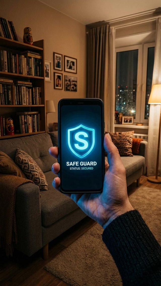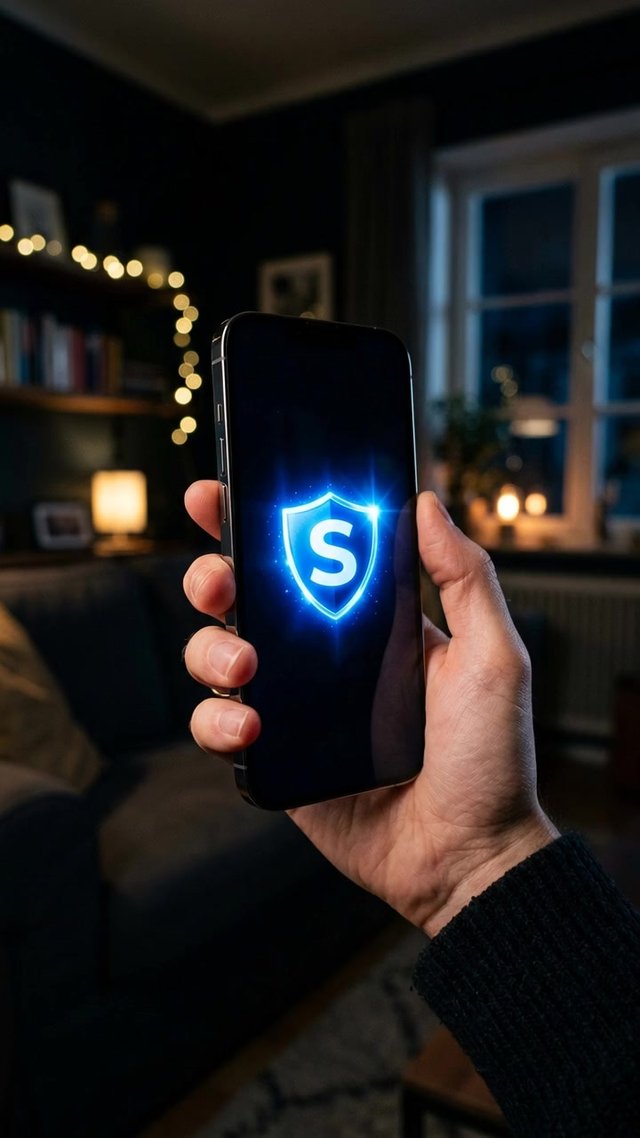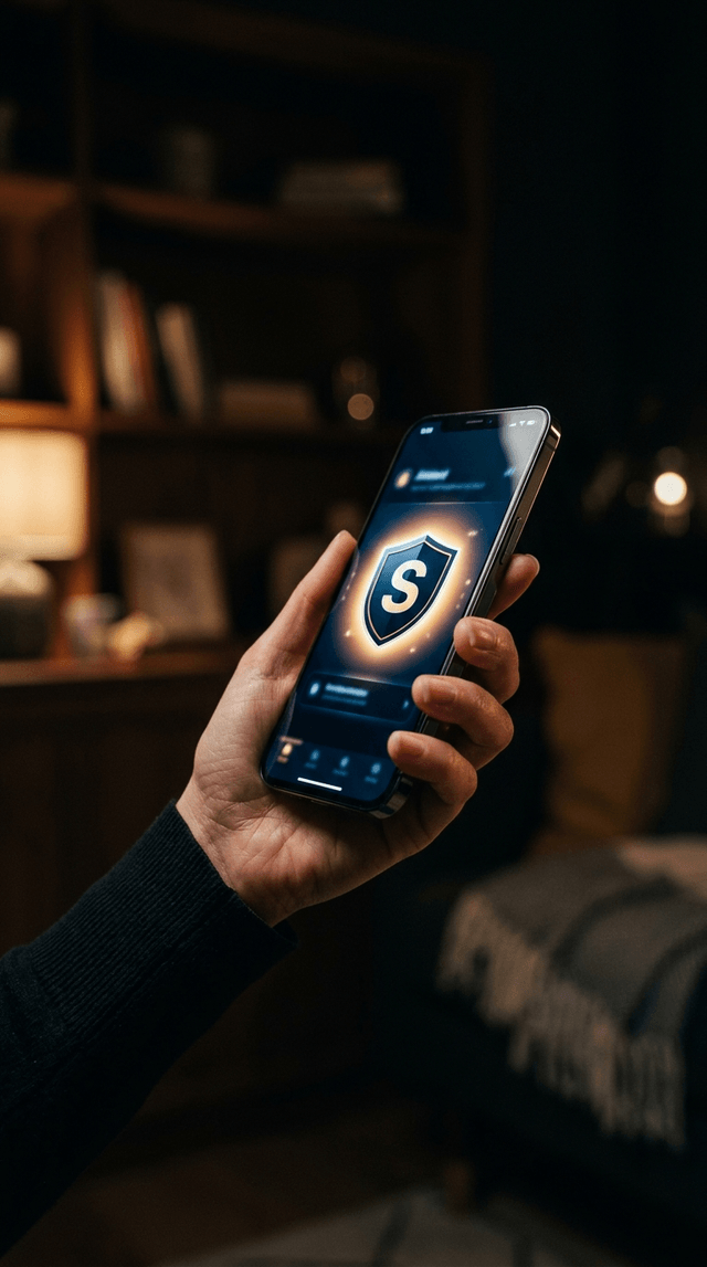 Медленное, плавное приближение к экрану смартфона. Иконка щита «S» пульсирует мягким, успокаивающим свечением. Квартира должна быть совр...