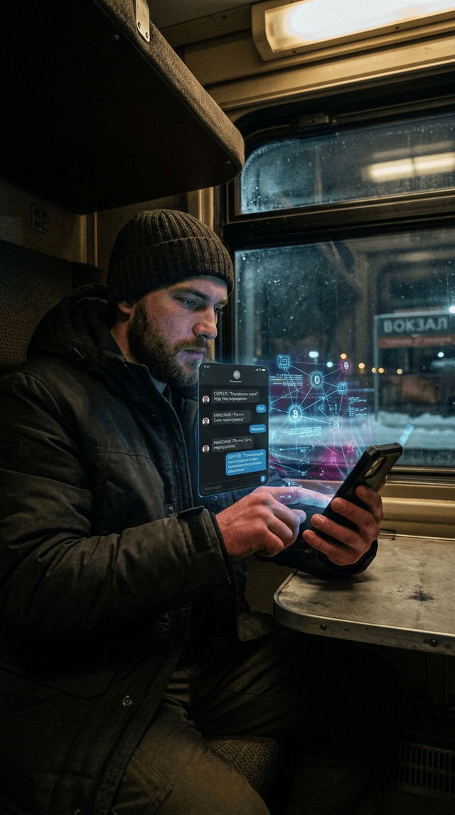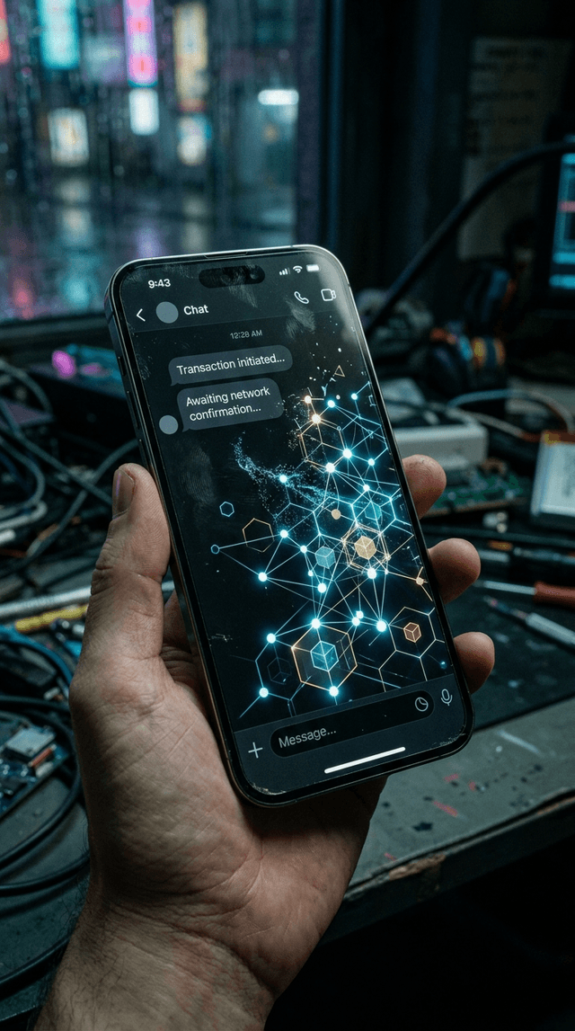 Экран смартфона плавно переходит в 3D-голограмму блокчейн-сети, расширяющуюся наружу.