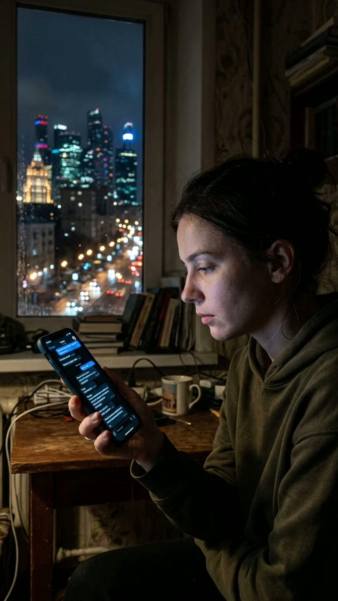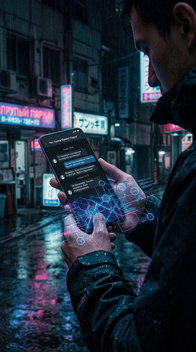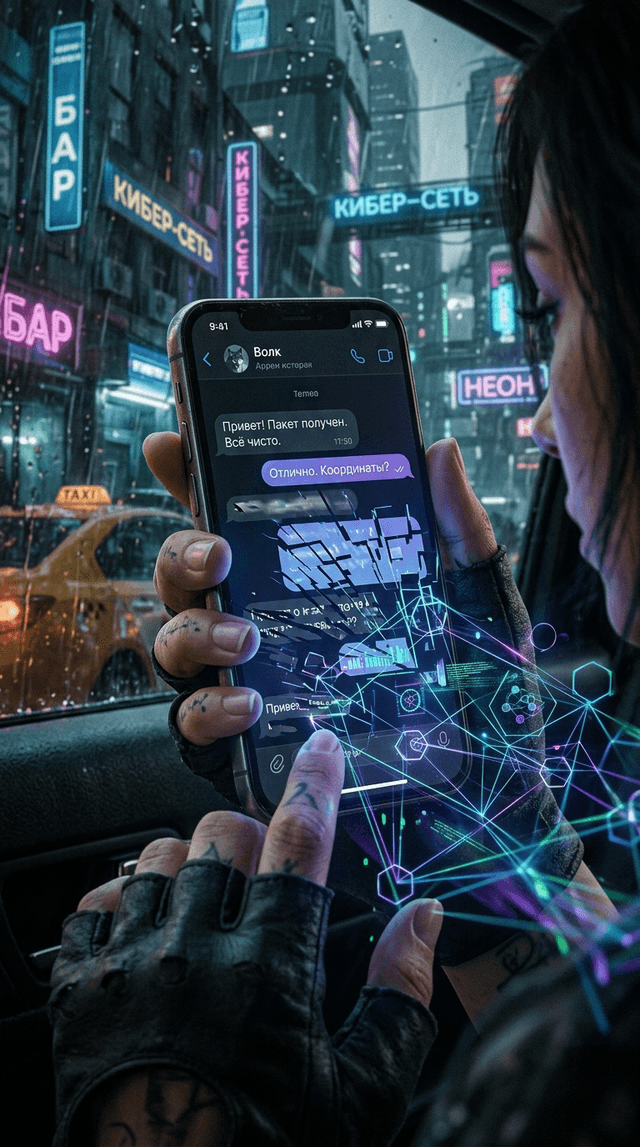 Strong rule: style --- Cinematic Realism, Cyberpunk, Documentary, Dark... ---. Кинематографический реализм, изящный экран смартфона, отоб...