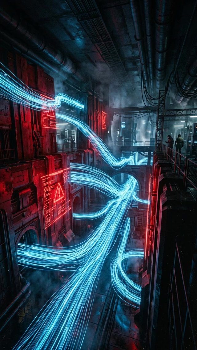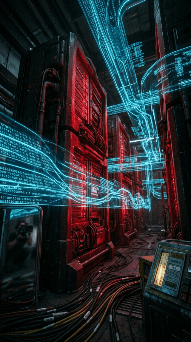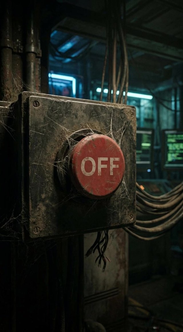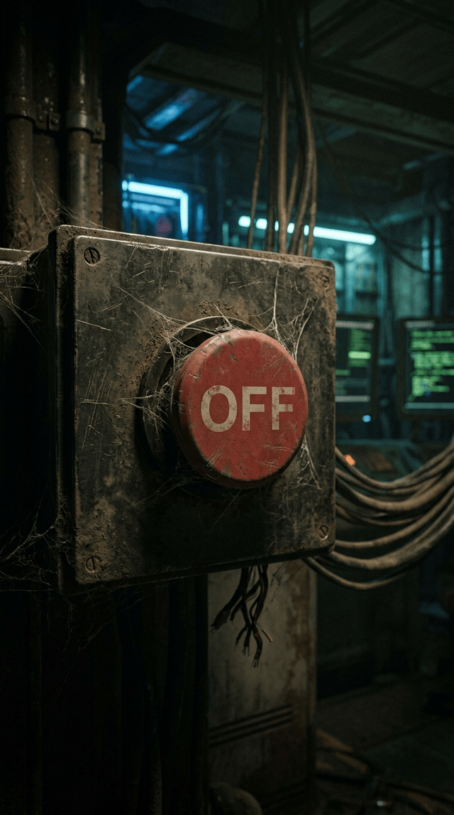 Медленный отъезд камеры от пыльной красной кнопки, открывая пульсирующий, неудержимый поток данных, проносящийся прямо над ней.