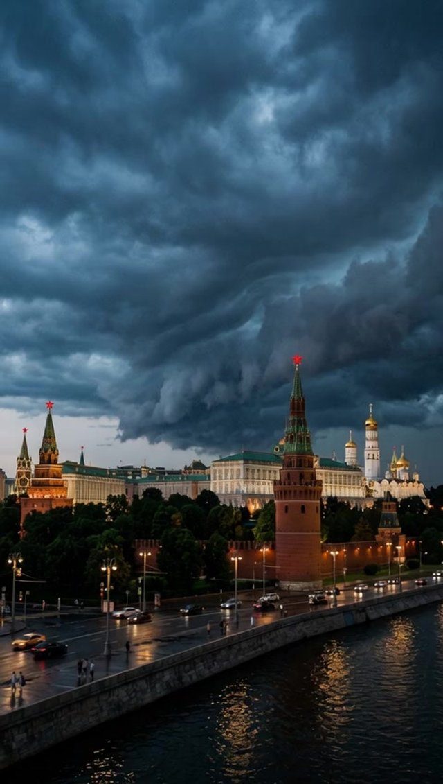 Медленное, драматичное наплывание дрона к стенам Кремля, кинематографичное движение, темная и мрачная атмосфера.