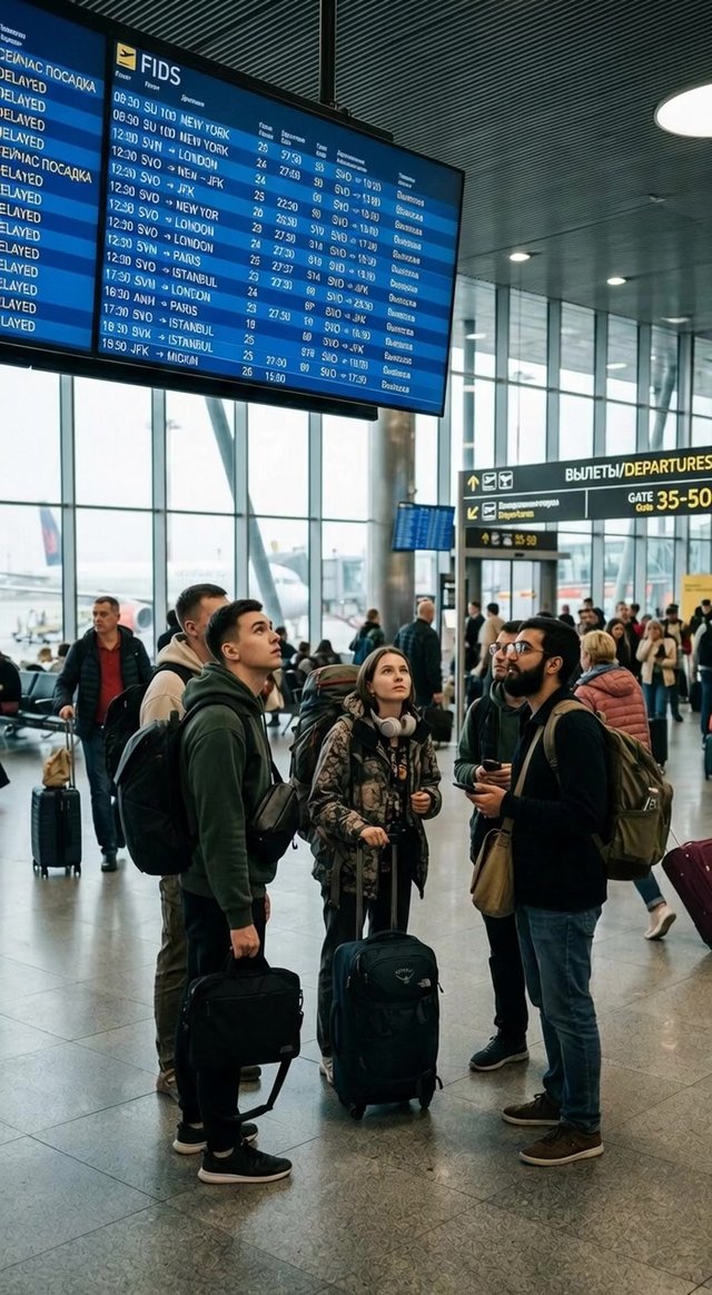 Медленный тревеллинг из-за спины человека, передающий масштаб аэровокзала и ощущение отъезда.